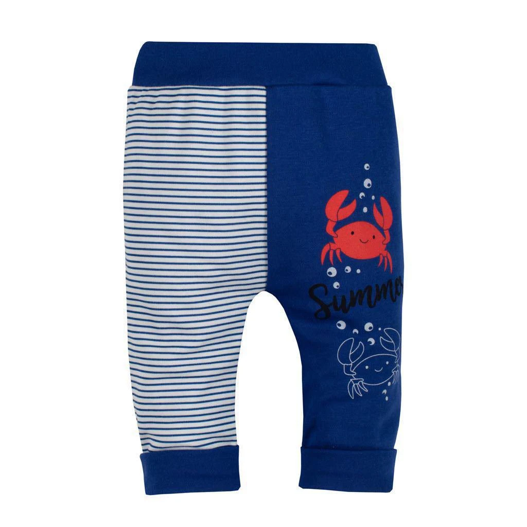 Tričko je bez zapínání a na krčku má pružný lem pro snadné oblékání. Tepláčky zdobí obrázek kraba s nápisem Summer a stále moderní prožky. V pase mají širší gumičku a nohavičky jsou ukončené manžetkami. Super letní hit a užitečný kousek do šatníku malých dětí.