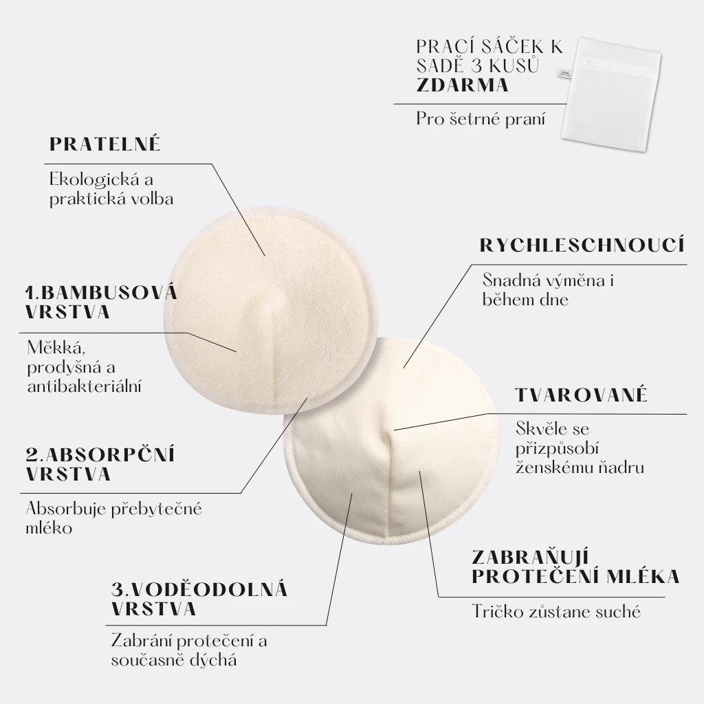 - Součástí sady je 1 pár (2 ks) bambusových prsních vložek s absorpční membránou, které absorbují přebytečné mateřské mléko.