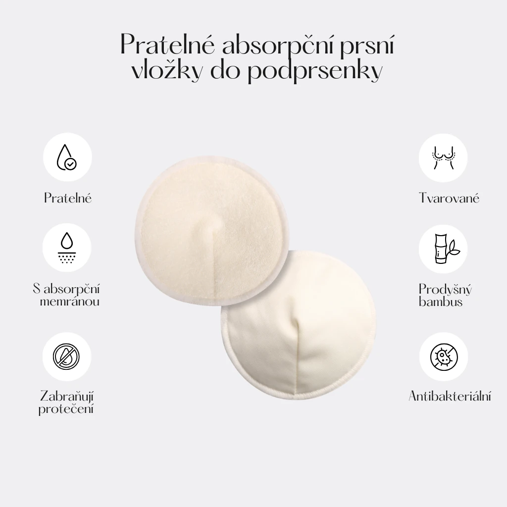 - Součástí sady je 1 pár (2 ks) bambusových prsních vložek s absorpční membránou, které absorbují přebytečné mateřské mléko.