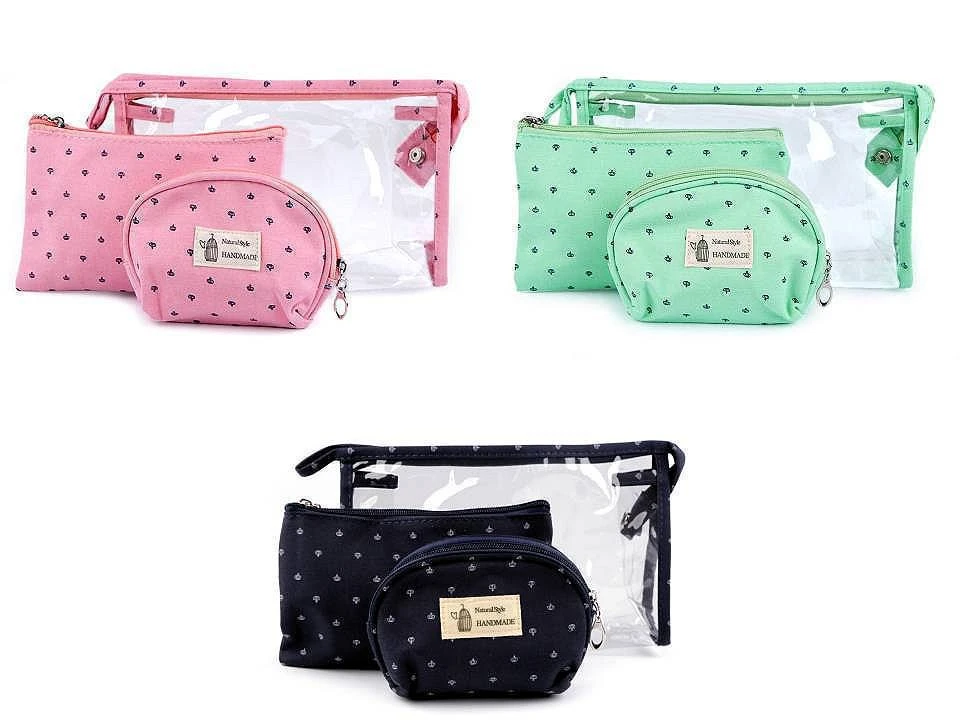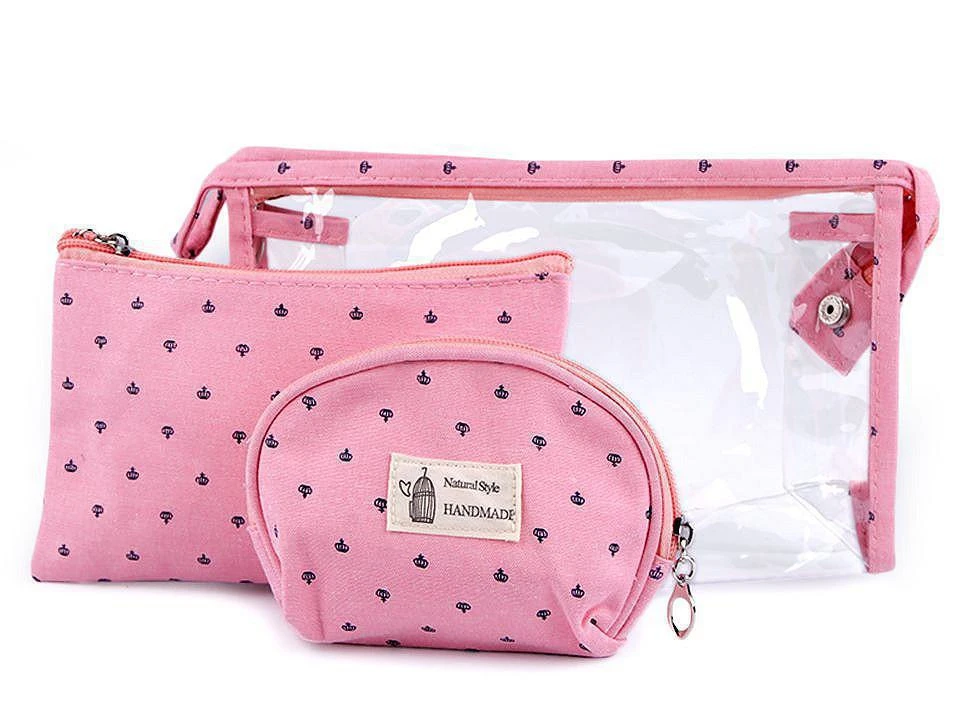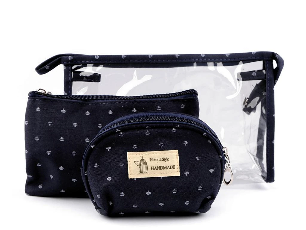 Velká taštička - 15 x 25 x 7 cm - je průhledná, má praktické poutko na pověšení, na druhé straně můžete konec zipu připnout na cvoček. Tašku si tak můžete připnout k poutku uvnitř zavazadla, což může zabránit její ztrátě. Prostřední textilní taštička - 13 x 19 x 1 cm - má uvnitř podšívku, malá textilní taštička - 11 x 14 x 3 cm - má také podšívku.