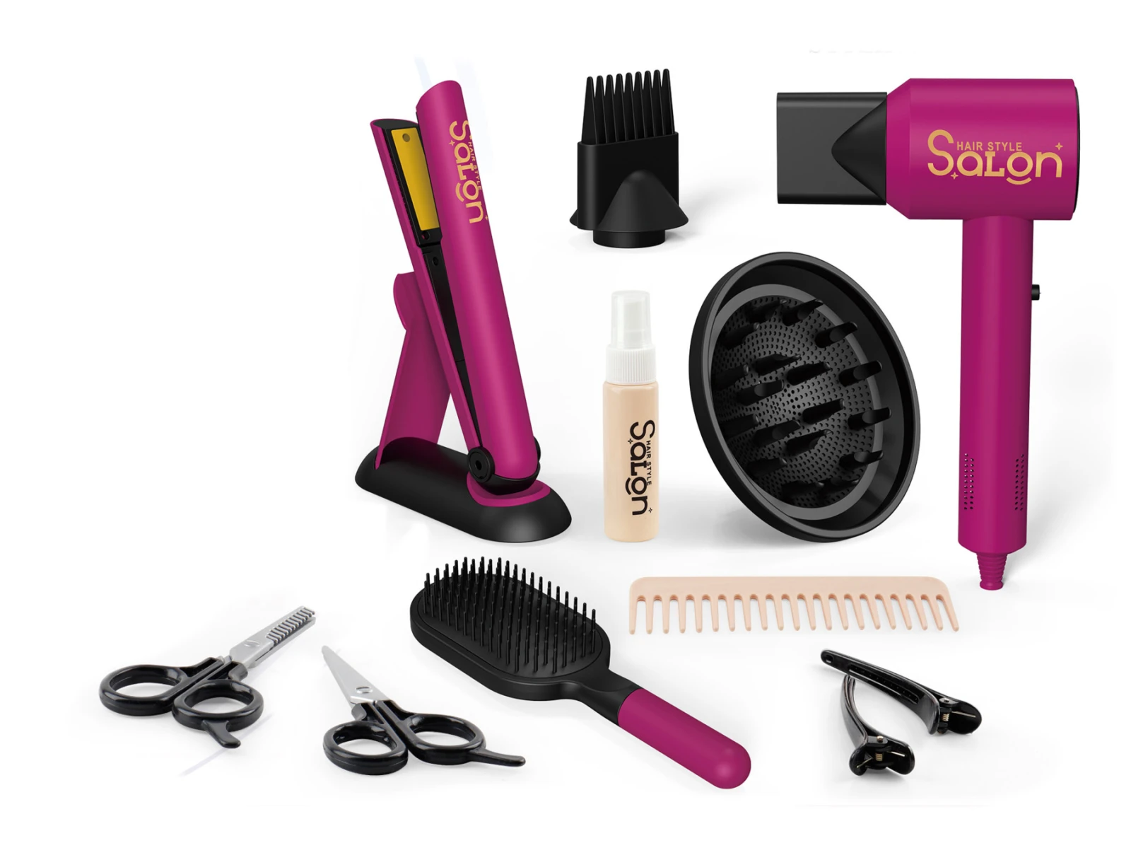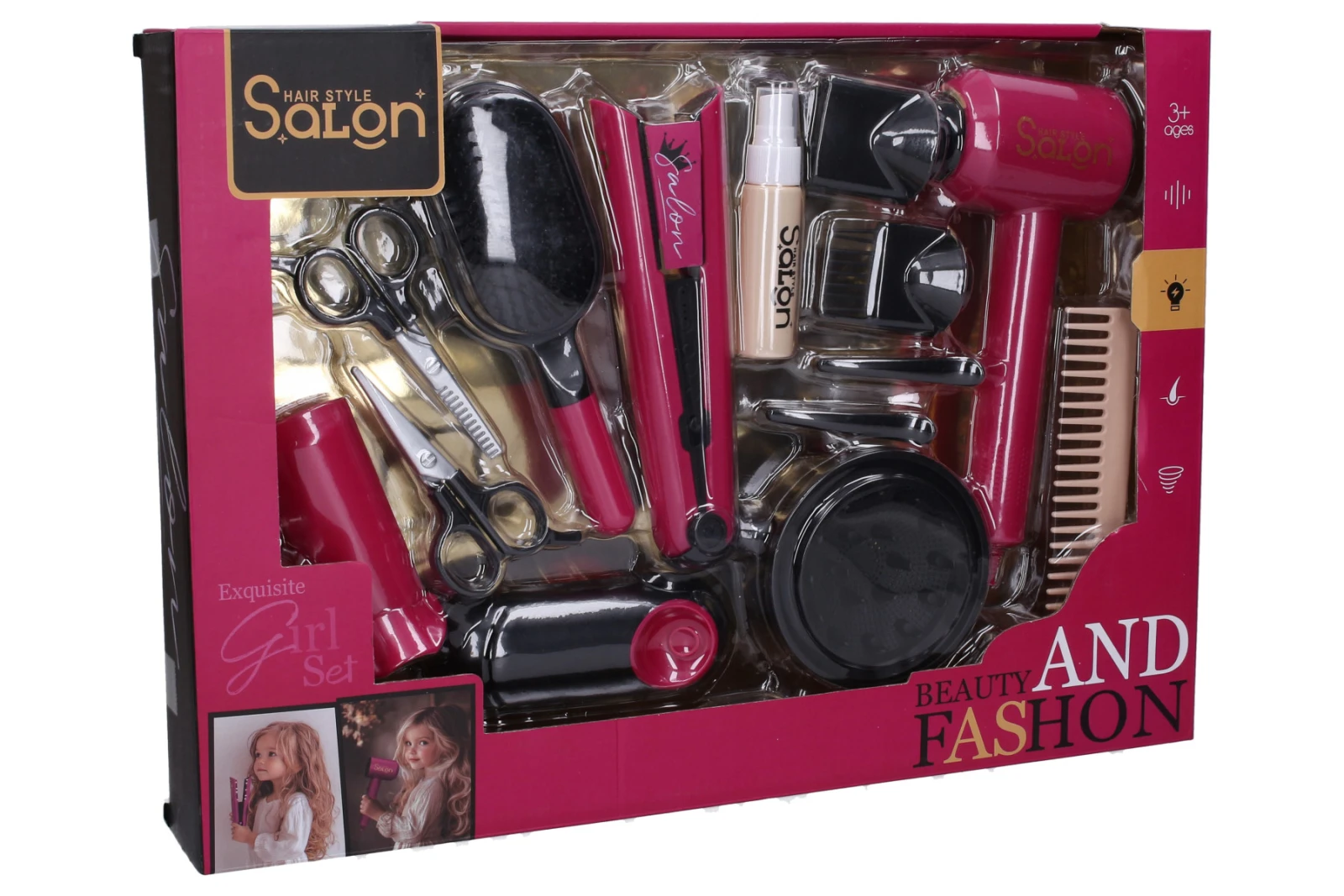 Obsahuje fén, žehličku, kartáč, hřeben, 2x nůžky, 2x sponky, sprej, nástavce.