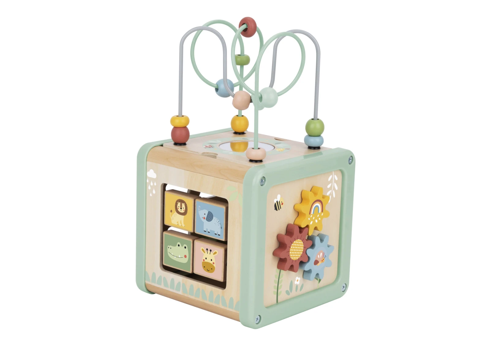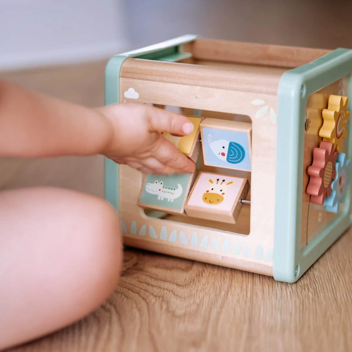 Krásná dřevěná akční kostka s motivy luk v jemných pastelových barvách od Tooky Toy se stane zdrojem smysluplné zábavy pro vaše batolata. Zahrnuje 5 různých motorických aktivit: bludiště se zvířaty, vkládání se 4 tvary, ozubená kola, rotující obrázky se zvířaty a motorové bludiště se zrcadlem. Víko, na kterém jsou upevněny labyrint i zrcadlo, lze snadno složit a znovu nabrat, aby děti mohly snadno vyndat geometrické tvary z kostky.