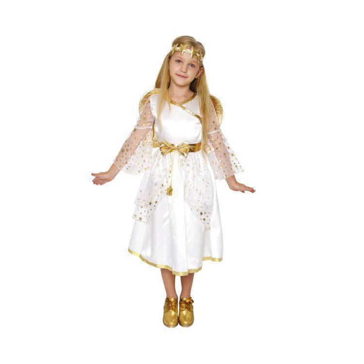Andělský kostým doplňují čelenka s hvězdnou aplikací a zlatá křídla, která se připínají pomocí suchého zipu v zadní části šatů.