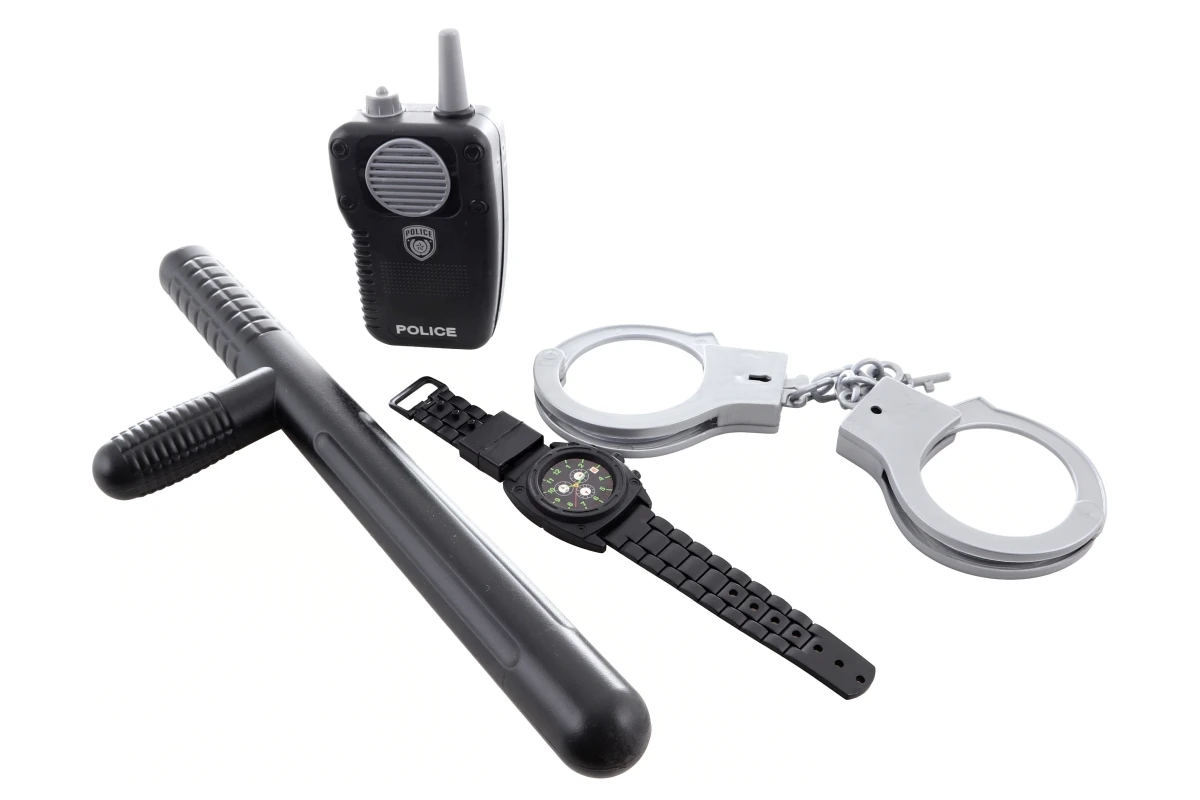 Obsah balení: policejní vesta, hodinky, vysílačka, pouta a obušek
