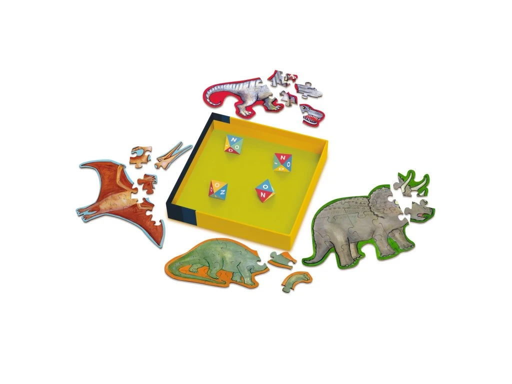 Balení obsahuje: 1 přihrádku na kostky, 4 kostky s 8 stranami a 4 dinosauří puzzle s 12 dílky (diplodocus, pterosaurus, tyrannosaurus a triceratops).