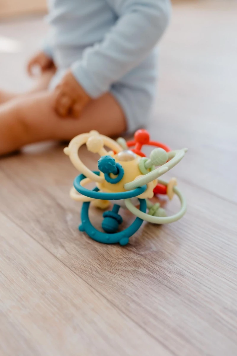 Kombinace silikonu a plastu, měkkých i pevných částí a různých tvarů podporuje přirozený rozvoj dítěte. Hračka je tvořena propletenými oblouky, které se snadno uchopují z každé strany. Uvnitř se nachází průhledná část s barevnými kuličkami, které při pohybu jemně chrastí a stimulují sluchové vnímání.