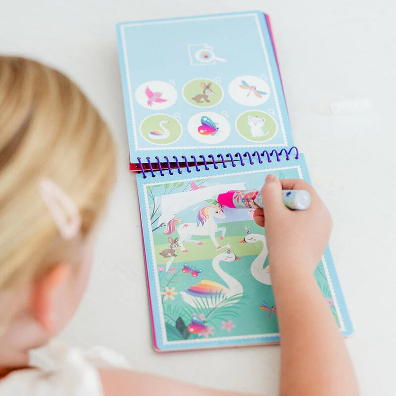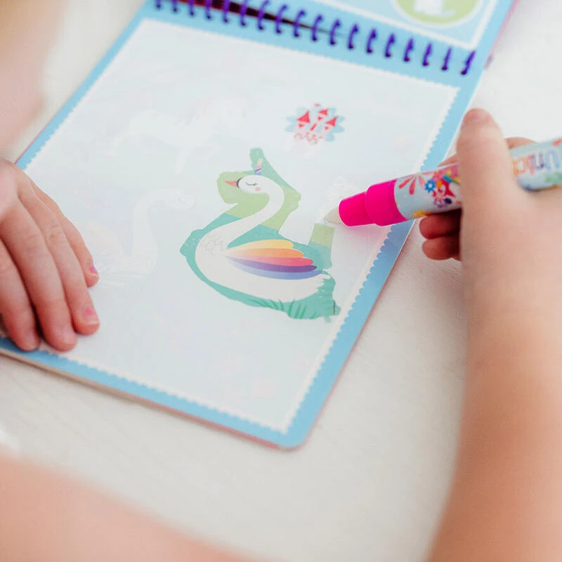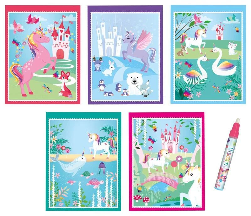 Sada obsahuje 5 znovupoužitelných obrázkových ploch z tvrdého kartonu s motivem jednorožců a speciální vodní pero, které lze snadno znovu doplňovat. Malování podporuje jemnou motoriku, soustředění i kreativitu a je ideální také na cesty.