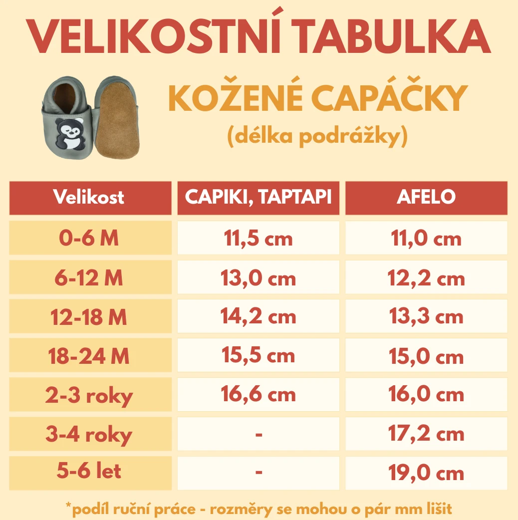 Vyrobeno z nezávadné kůže ve stejné fabrice, jako se vyrábí capáčky pro anglickou značku MiniFeet (jsou tedy stejně šité); představují bezkonkurenční poměr kvality a ceny. Testováno v české laboratoři a splňují všechny evropské normy pro děti do 3 let.