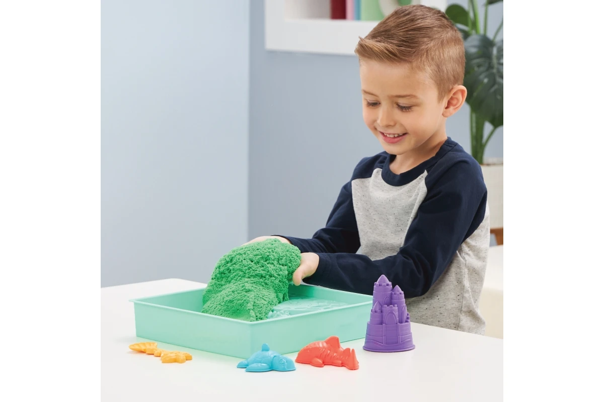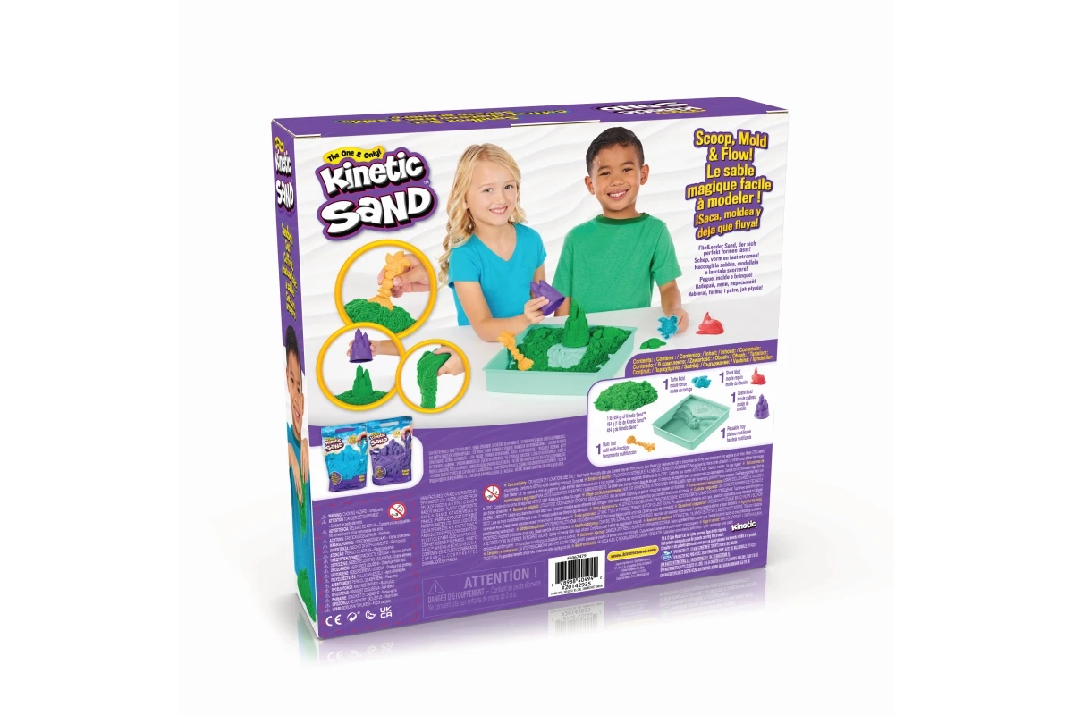 Jedinečné složení kinetického písku umožňuje ho snadno tvarovat, mačkat a tvořit z něj cokoli, co si jen dokážete představit. Ze 450 gramů zeleného kinetického písku můžete stavět hrady, žraloky a želvy a ke kopání, nabírání, sypání a tvarování použít přiloženou lopatku. Součástí této sady kinetického písku je i dvoupatrový zásobník na písek ideální pro hru v interiéru.