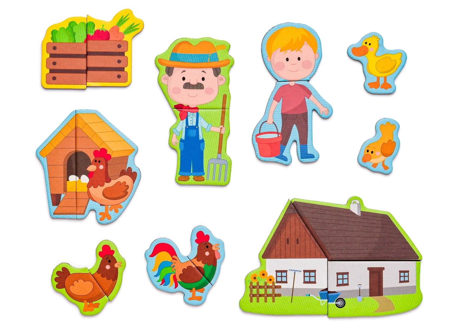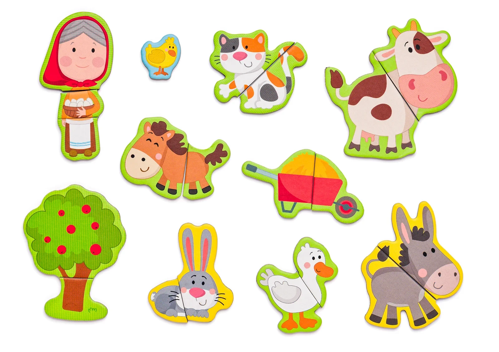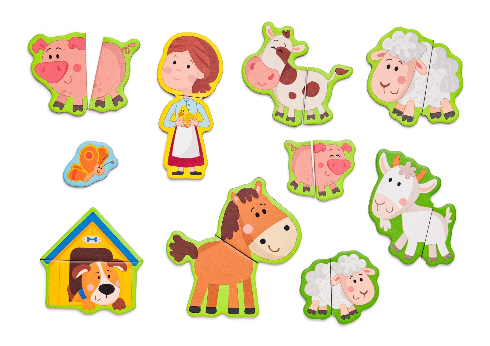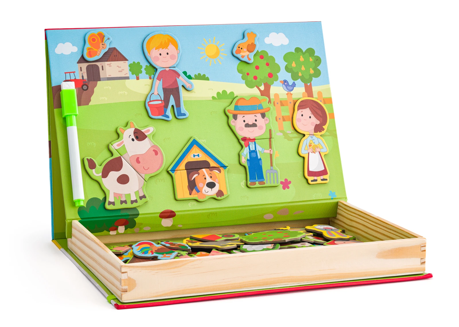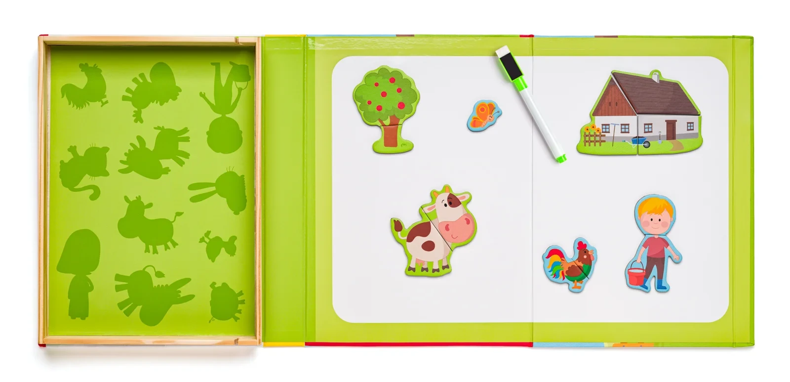 Otevřete dřevěnou krabičku plnou magnetických zvířátek, lidiček, domečků a dalších prvků s motivem farmaření. Každý motiv se navíc musí poskládat z více částí. Dítě je umisťuje na magnetické víko s obrázkem statku a louky. Inspiruj se přiloženými kartičkami s předlohou.