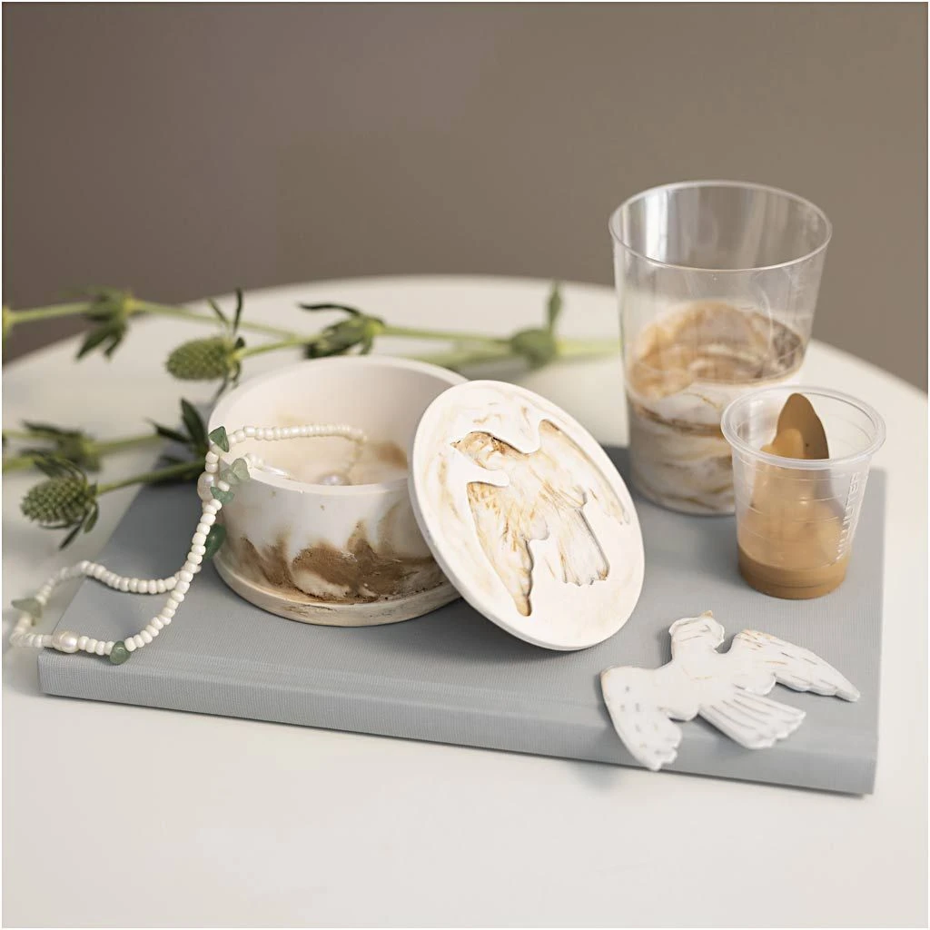 • Smícháte odlévací prášek s vodou a přidáte barvu – mícháním do kruhu vytvoříte efektní mramorovaný vzor