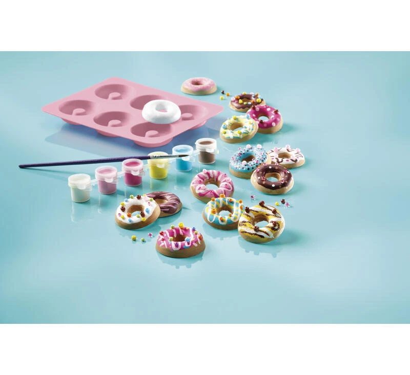 Balení obsahuje: sádru, 7 barev v uzavíratelných kelímkách, štětec, silikonovou opakovatelně použitelnou formu na 6 donutů, skleněné korálky, třpytivý písek, lepidlo, kartonovou krabička na donuty, návod na použití.