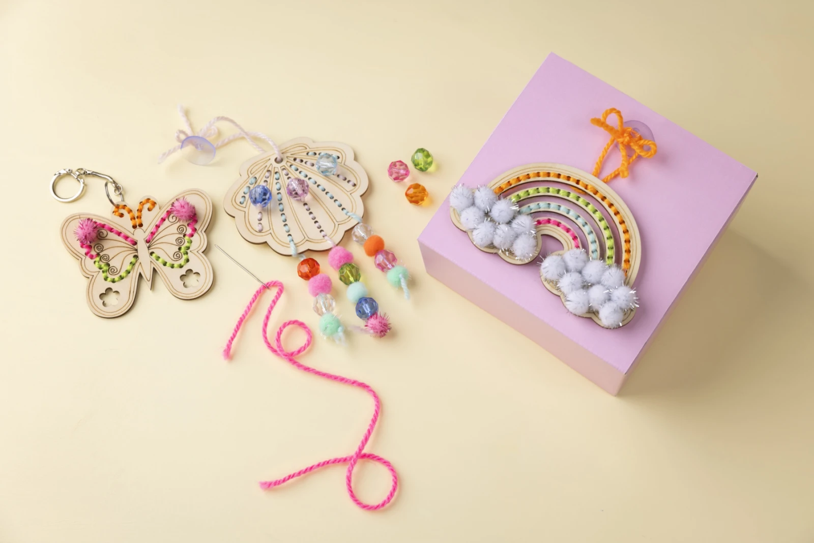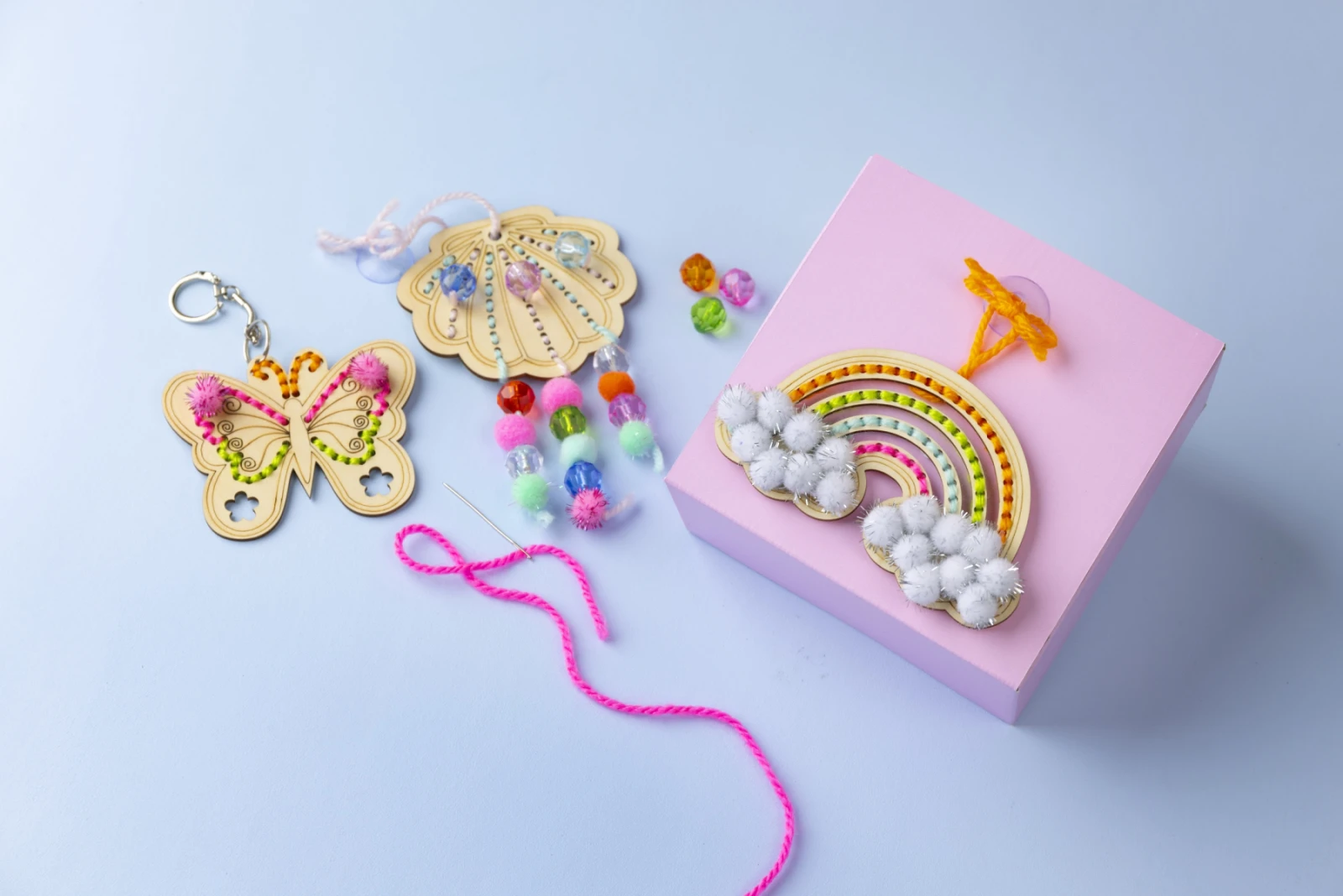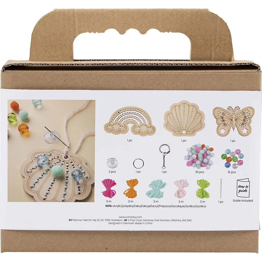 dřevěné předlohy s otvory pro vyšívání, barevná příze, vyšívací jehla, korálky a bambulky, komponenty (např. kroužek na klíče, přísavky), návod krok za krokem.