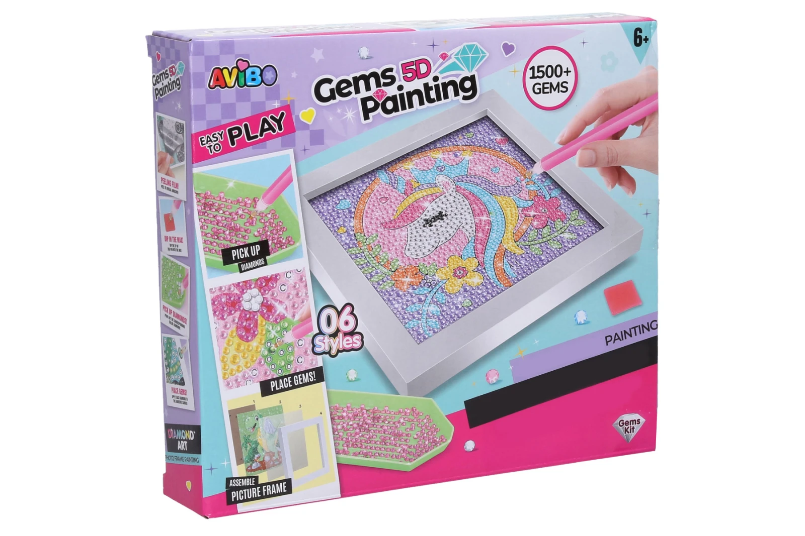 Obsahuje misku na kamínky, pero na nabírání a umísťování kamínků, kamínky různých barev, vosk, rámeček. Postup: z obrázku sloupněte folii, špičku přiloženého pera přiložte na vosk, perem naberte kamínek, umístěte ho na obraz.