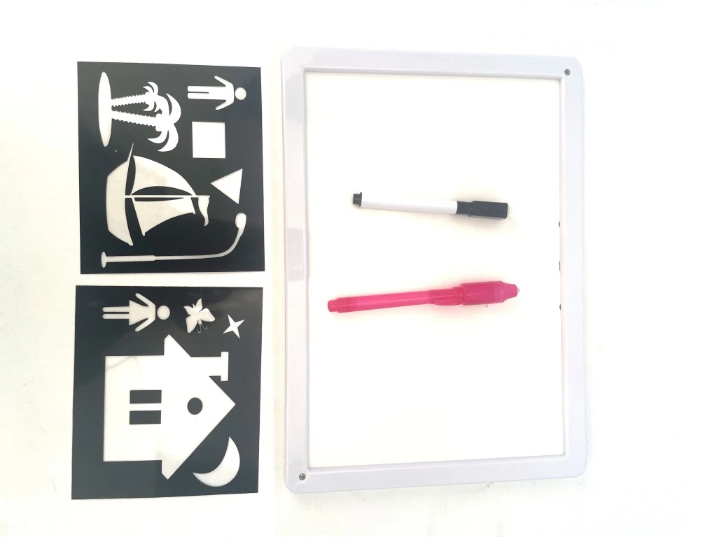 Součástí balení jsou dvě tužky – jedna speciální svítící, druhá klasická, která slouží jako běžné kreslící náčiní na druhou stranu tabulky, která je zároveň i tabulí pro mazání. Díky tomu má tabulka dvojí využití – svítící kreslení a běžné kreslení na bílou plochu. Kromě tužek jsou k dispozici také šablony s různými tvary, jako jsou dům, loď, raketa, postavičky či měsíční motivy, které usnadňují tvorbu obrázků a rozvíjejí dětskou představivost.