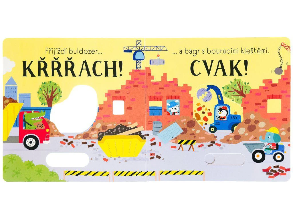 Přijíždí buldozer KŘACH! a tady bagr s bouracími kleštěmi CVAK! Podívej se na stránky, posuň obrázky a poslechni si k tomu zvuky nejrůznějších strojů ze stavby. V této zvukové knize s posuvnými prvky se seznámíš s buldozerem, s bagrem či se silničním válcem, naučíš se je poznávat podle zvuků a procvičíš si i jemnou motoriku.