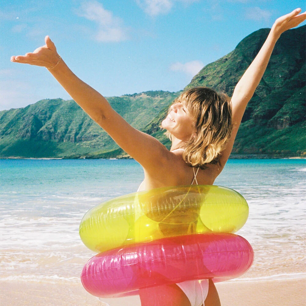 Výrazné barvy přinášejí letní energii a zajistí, že budete na pláži i u bazénu nepřehlédnutelní. Díky kompaktnímu provedení je kruh lehký, snadno přenosný a po vyfouknutí skladný – ideální na dovolenou i každodenní použití.