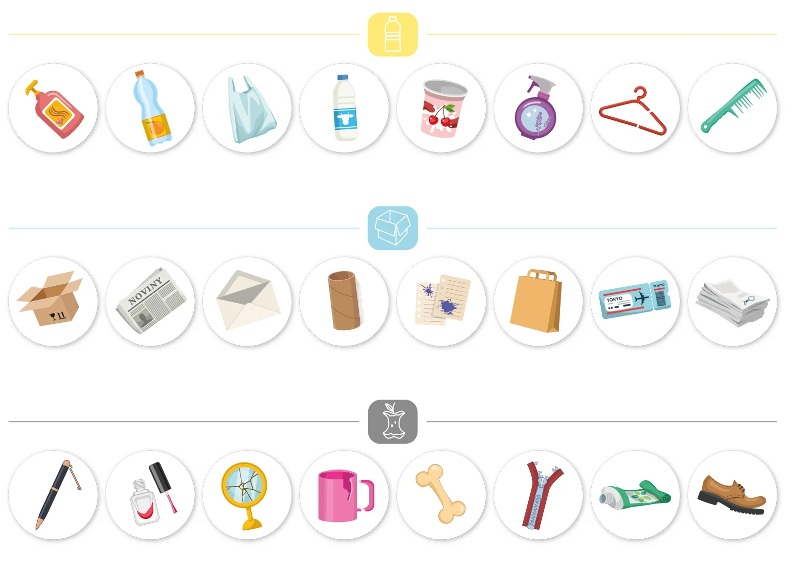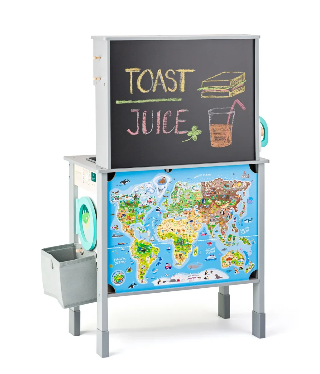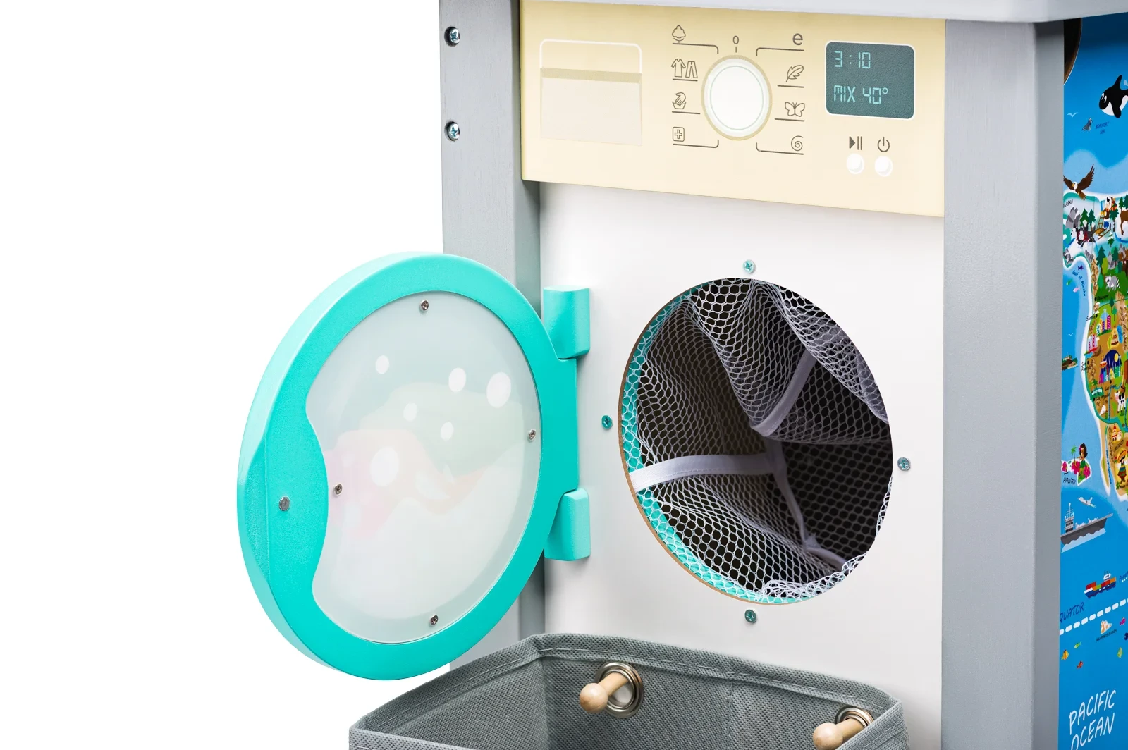 Z pravého boku najde dítě pračku s košem na prádlo, z levého boku pak žehlící prkno s žehličkou. Zadní strana je tvořena tabulí a mapou. Jako bonus jsou součástí tohoto výrobku i kartičky s obrázky odpadků, které dítě třídí a vkládá do správných otvorů pro tříděný odpad.