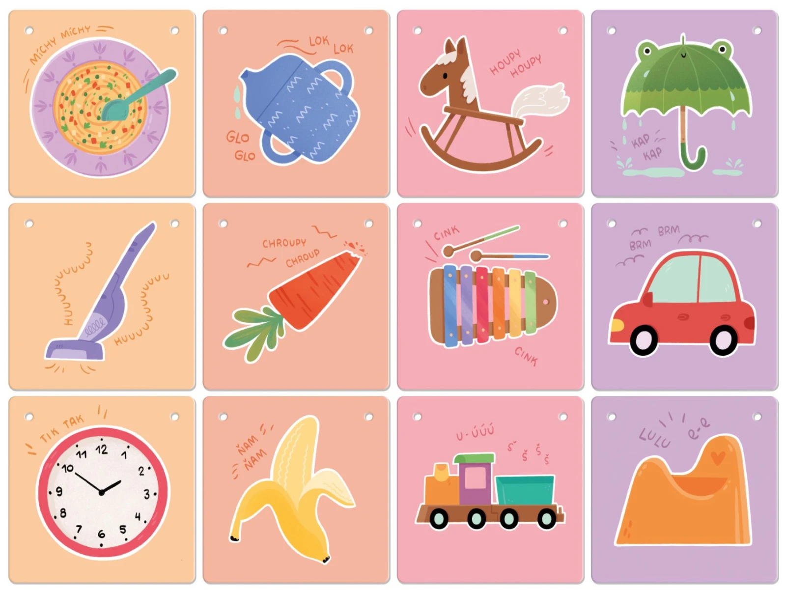 Ideální pomůcka před prvními slovy – dítě může na obrázky reagovat zvukem dřív, než začne mluvit. Sada výborně navazuje na kontrastní karty KukiKuk.