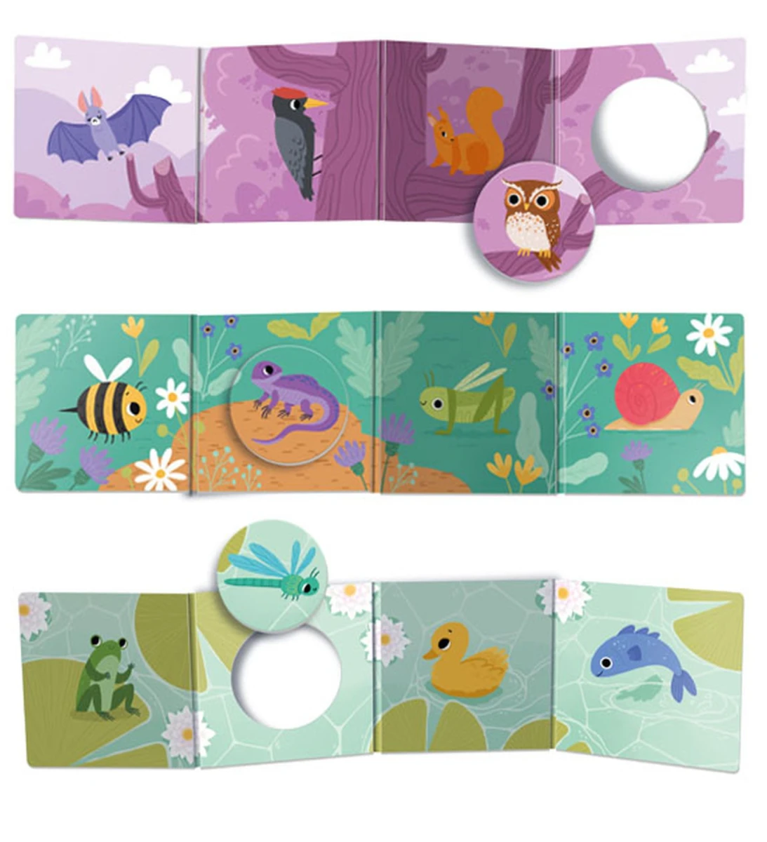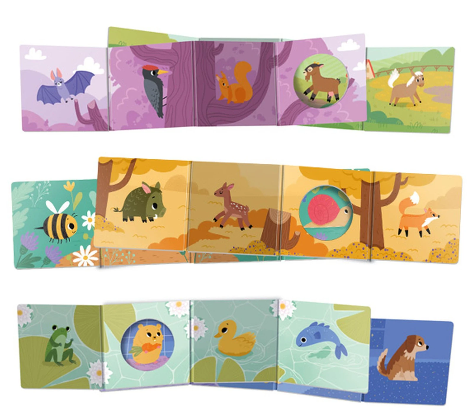 Kuki-příběh se zvířátky - použijte leporelo jako kulisy ke krátkému příběhu – vyprávějte, jak se zvířátka setkávají, navštěvují jiná prostředí a co zažívají. Otvorem sledujte dění na druhé straně.