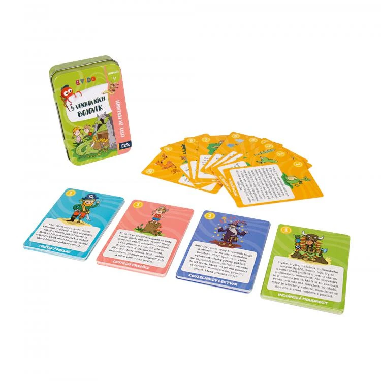 Hra 5 venkovních bojovek - Cesty za pokladem obsahuje: 50 ilustrovaných karet s příběhy a úkoly a návod k přípravě bojovek.