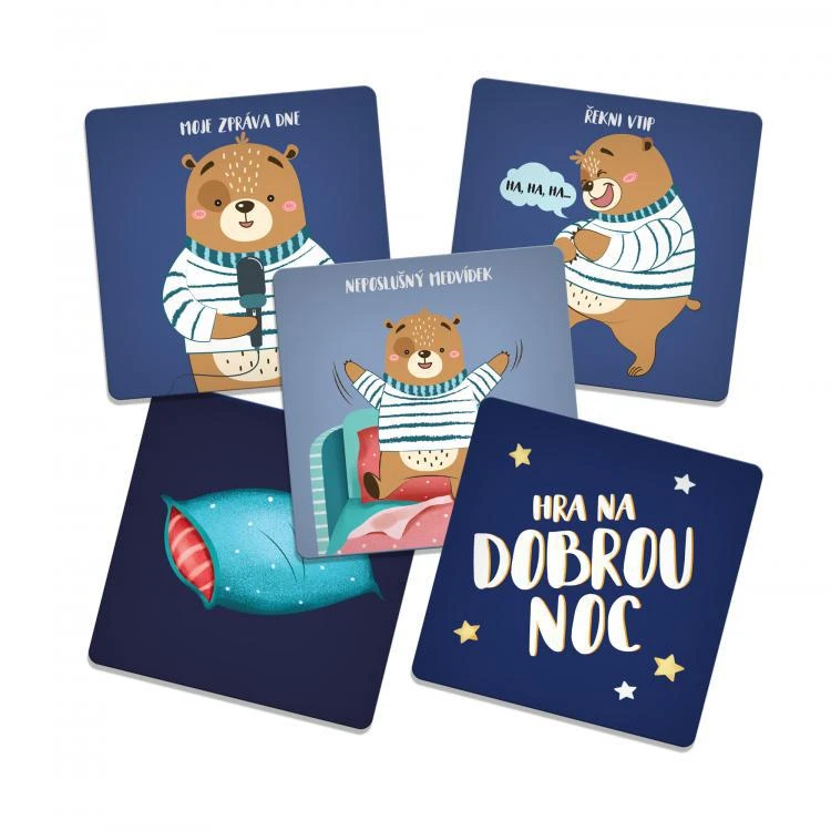 Děti postupně obrací karty s aktivitami, než najdou 3 karty toho, co potřebuje medvídek k usnutí: polštářek, přikrývku a srdíčko. Poté uloží medvídka do postýlky a vy si společně užijete vybrané aktivity, např. zpívání, uvolňující jógu nebo dýchání, podělíte se o zážitky z vašeho dne, rozdáte si pusinky i objetí a možná se necháte i polechtat.