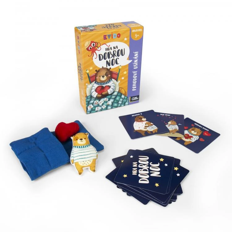 Hra na dobrou noc - Kvído obsahuje: textilního medvídka, peřinku s polštářkem, plyšové srdíčko, 23 karet s různými úkoly a aktivitami, přehledovou kartu s jógovými pozicemi a vědomým dýcháním.