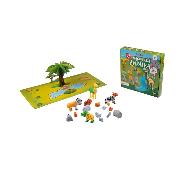Hra Magnetická zvířátka obsahuje: 7 magnetických zvířátek (tygr, zebra, žirafa, krokodýl, slon, nosorožec, lev) ze 4 částí, rozkládací hrací desku.
