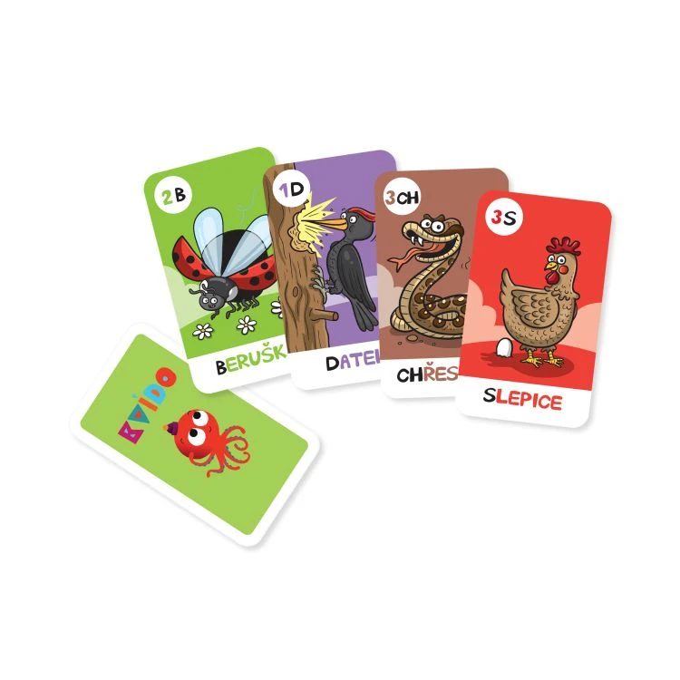 Seznamte děti s písmeny české abecedy pomocí zábavných her: písmenkové kvarteto, autobus nebo švindl. Z písmen lze také tvořit slova nebo věty. Na každé kartě je obrázek zvířete, jehož název na dané písmeno začíná.