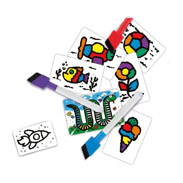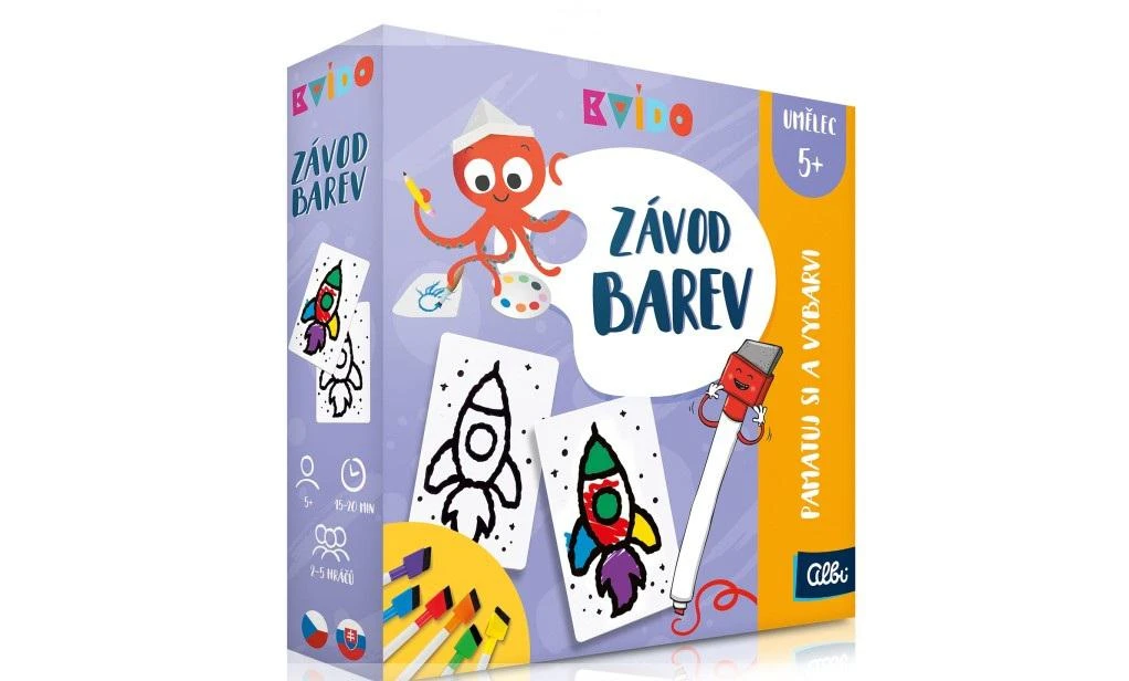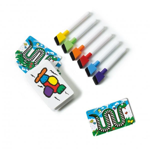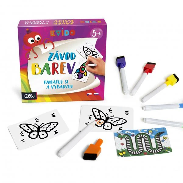 Ve hře najdete celkem 55 obrázkových karet, takže nudy a opakování se rozhodně bát nemusíte. Závod barev obsahuje také 6 barevných fixů s mazací houbičkou pro snadné a opakované používání obrázkových karet.