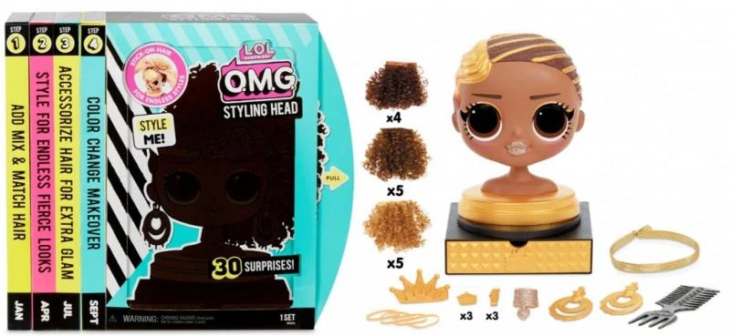 Obsah balení:* O.M.G. Česací hlava na otočném podstavci se zásuvkou* 14 příčesků pro opakované nasazování* 10+ doplňků