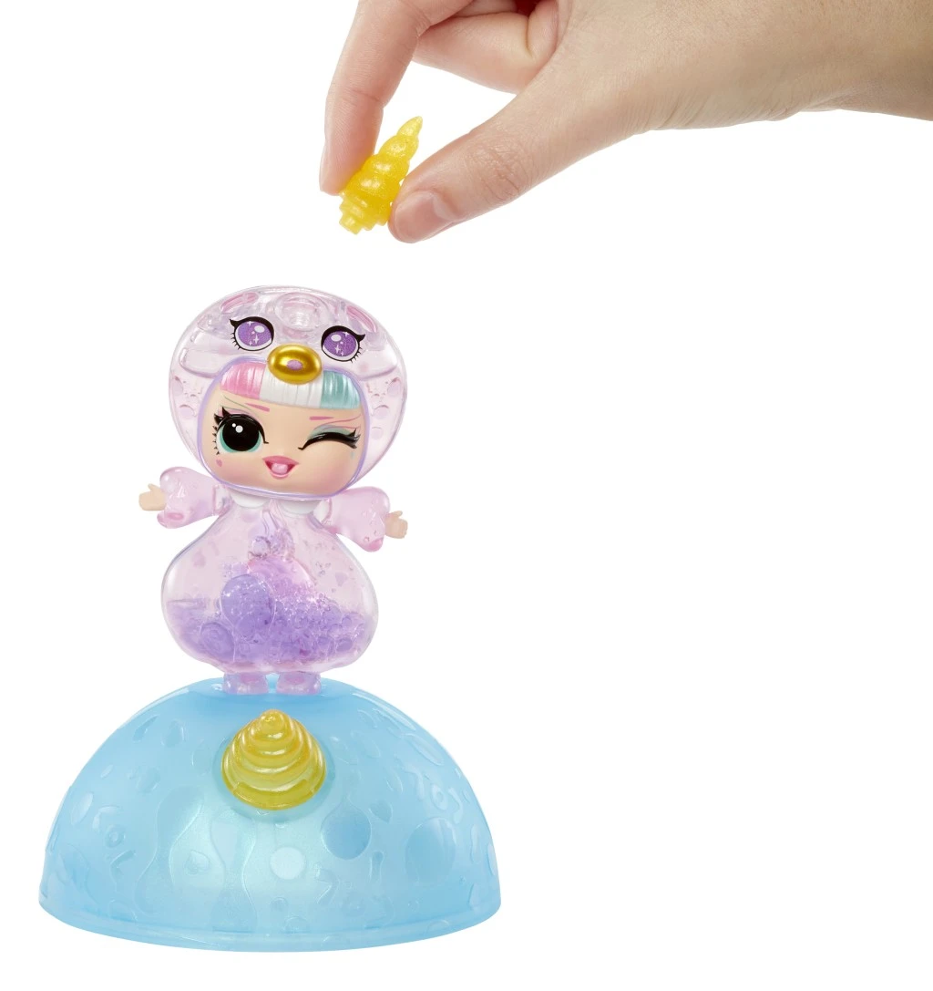 V balení najdete dvě lahvičky s barevnou tekutinou, kterou naplníte tělo panenky. Po naplnění budou uvnitř panenky klouzat barevné bubliny a vytvářet fascinující pohyb, který děti okamžitě zaujme. Panenka má česatelné vlásky s možností připnutí doplňků a je součástí série, ve které lze nasbírat celkem osm různých postaviček.