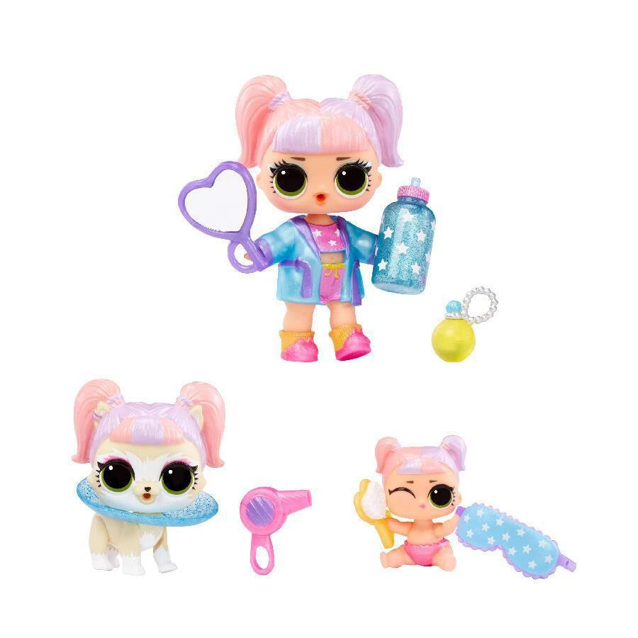 Velikost figurek: velikost panenky cca 8 cm, velikost sestřičky cca 4,5 cm, velikost zvířátka cca 6 cm.