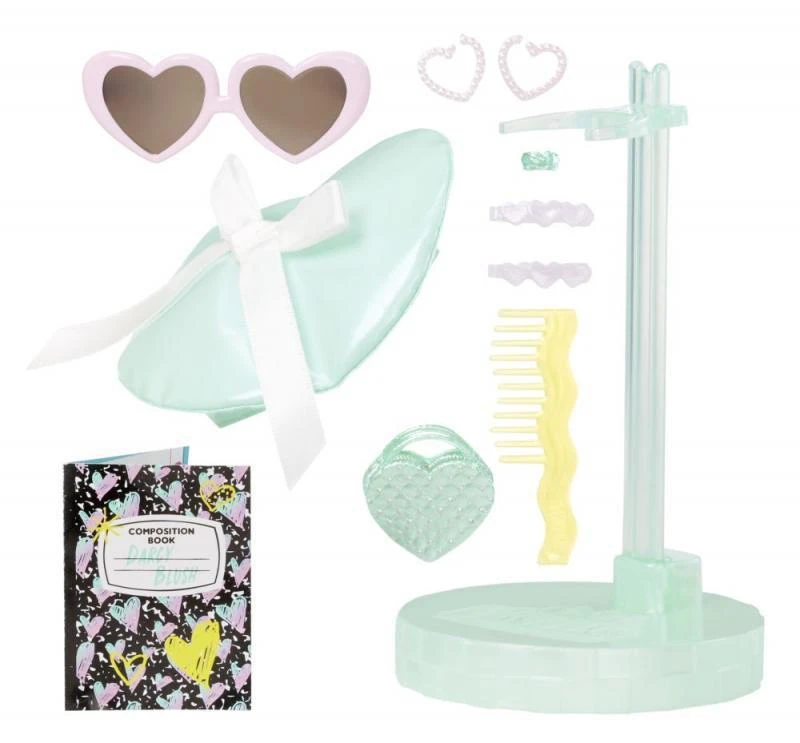 15 různých doplňků včetně nádherných oblečků, bot, kartáče na vlasy, časopisu a stojanu pro panenky