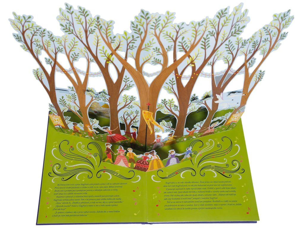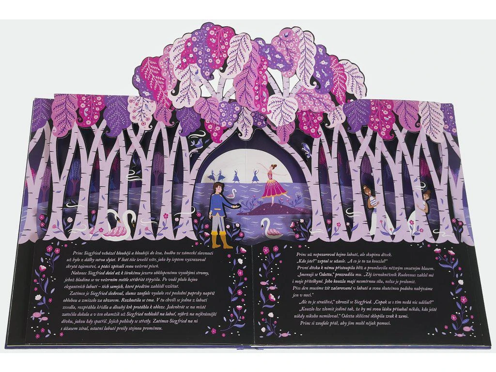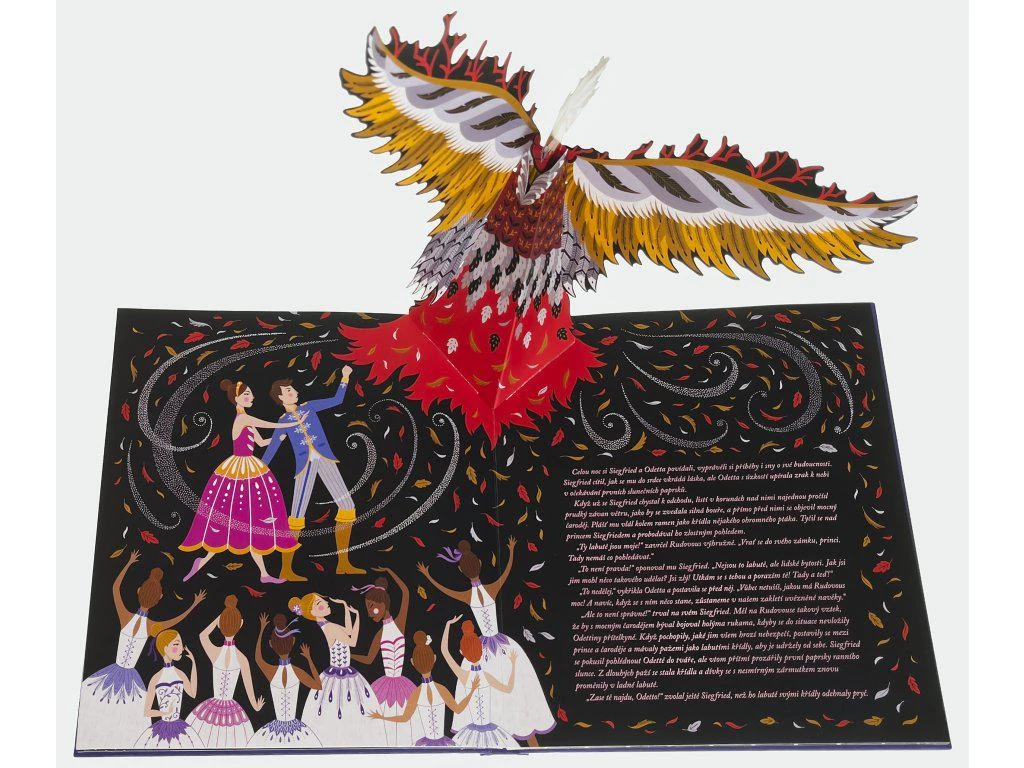 "Jmenuji se Odetta. Zlý černokněžník Rudovous zaklel mě i moje přítelkyně. Jeho kouzla mají nesmírnou sílu, nelze je prolomit. Přes den musíme žít začarované v labutě a svou skutečnou podobu nabýváme jen v noci." Mladý princ Siegfried právě dosáhl plnoletosti a musí si vybrat manželku. Zalíbení najde v půvabné princezně Odettě, která je zakletá v podobě labutě a jen pravá láska ji může vysvobodit. Podaří se princi zlomit zlou kletbu? Kouzelný příběh o spanilých labutích a síle lásky je známý svým baletním zpracováním. Tato krásná pop-up kniha převypráví původní příběh i známé libreto Čajkovského baletu způsobem, který je přístupný a poutavý pro malé čtenáře. Díky úžasným pop-up ilustracím, které příběh inovativně oživují, sleduje tato kniha mladého prince a zakletou princeznu, jak si poradí s nástrahami zlého kouzelníka. Bude mít náš příběh šťastný konec? Jednoduché a elegantní převyprávění příběhu v kombinaci s důmyslnými a uchvacujícími pop-up ilustracemi činí z této knihy skutečný poklad každé knihovničky.