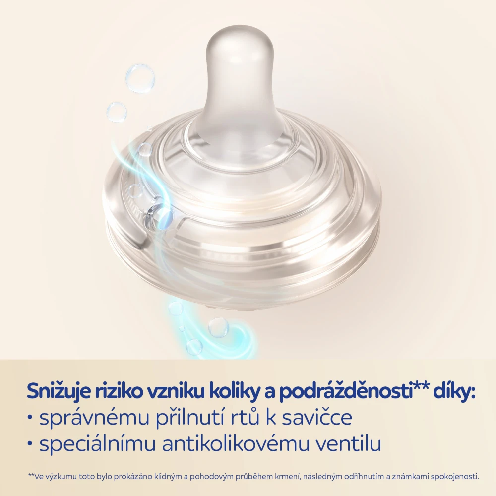 Lahev je vybavena inovativní dvouzónovou savičkou s technologií DuoFlex, která umožňuje přirozený rytmus sání dítěte. Flexibilní špička napodobuje přirozený pohyb matčiny bradavky během sání. Stabilní základna připomíná tvar prsu a umožňuje přirozenou, širokou, „rybí“ polohu rtů na savičce, což umožňuje plynulý a nepřerušovaný sací pohyb bez polykání vzduchu, čímž se snižuje riziko vzniku koliky a bolestí bříška**.