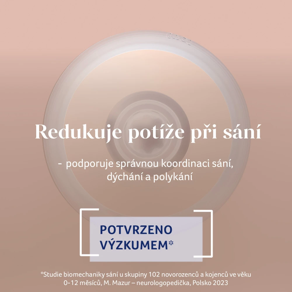 Široký, profilovaný tvar po vzoru maminčiných prsou a dokonalé proporce zajišťují, že ústa dítěte jsou umístěna ve správném úhlu, rty jsou pevně sevřené a dítě může volně dýchat nosem, což snižuje riziko vzniku koliky.