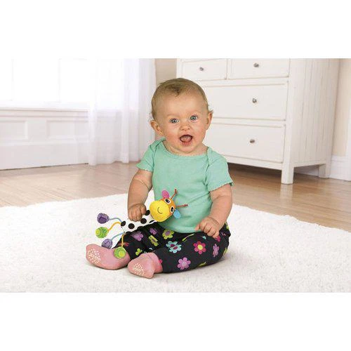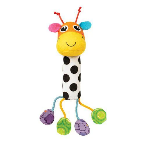 Po zmáčknutí tělíčka v podobě měkkého černo-bílého válečku žirafa zapíská. Hlavička žirafy zaujme přátelským pohledem a veselými barvami.