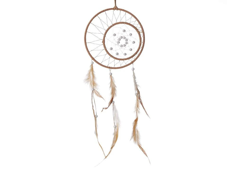 Lapač snů v přírodních tónech si oblíbíte jako interiérovou dekoraci. Střed kruhu zdobí menší kruh s perlovými korálky. Oba kruhy jsou vypletené síťkou a omotané eko kůží. Na provázcích visí peříčka, která jsou také doplněna korálky.