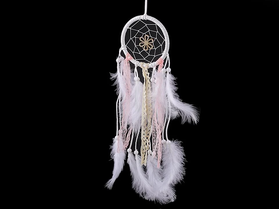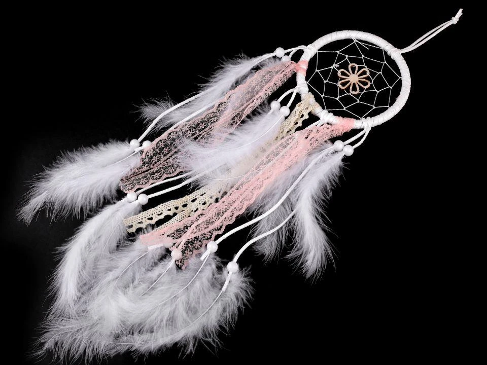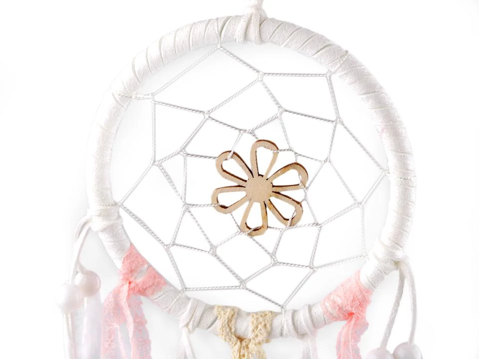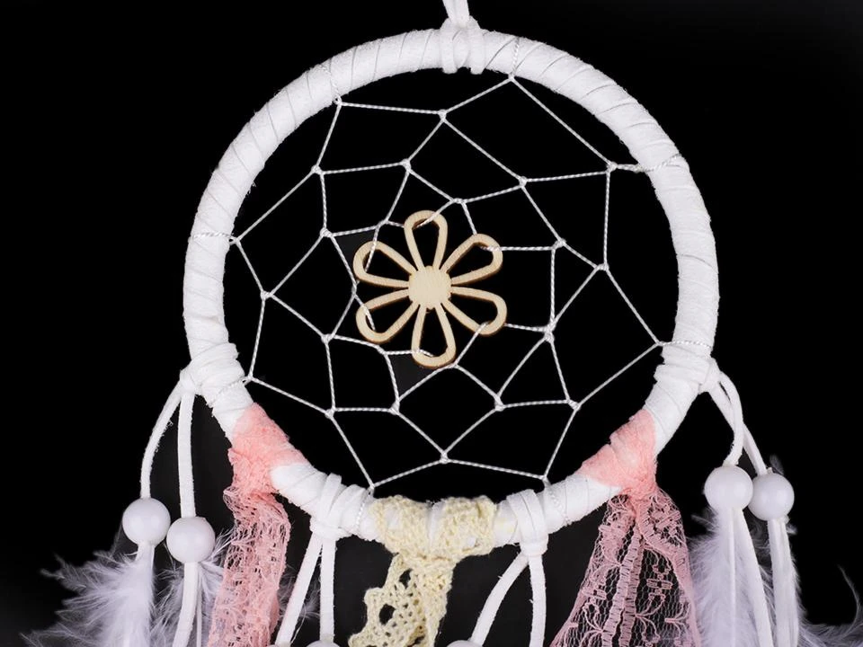 Lapač snů s peřím růžovo-bílý s dřevěnou kytičkou