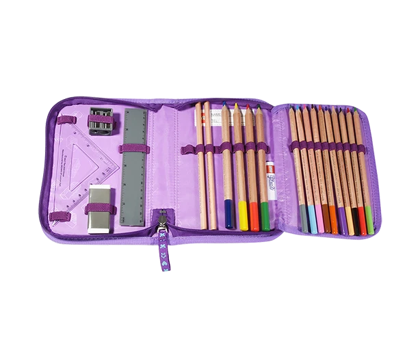 Náplň: 2 tužky, 10 pastelek, 4 široké pastelky, guma na gumování, ořezávátko, 2 pravítka.