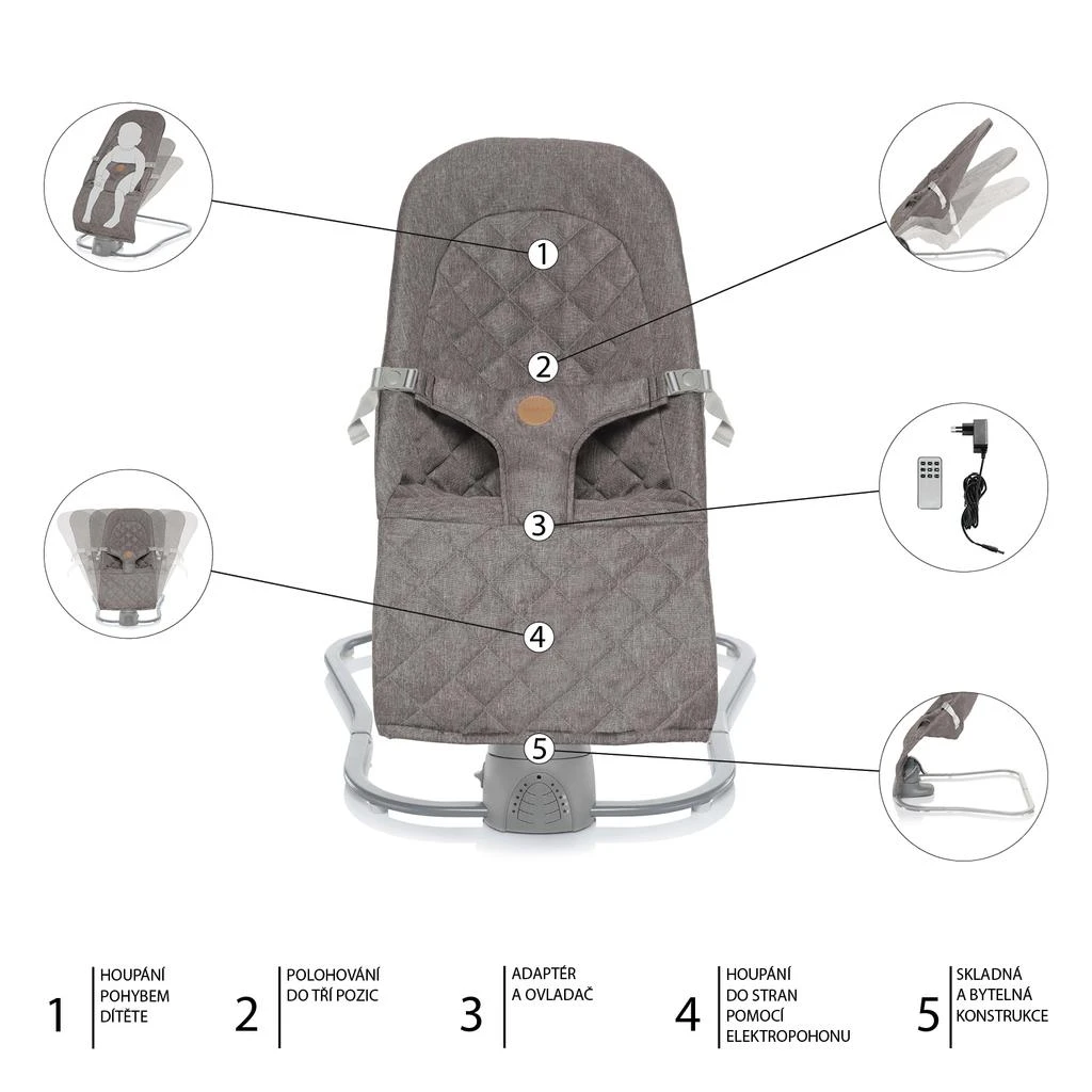 Zádová opěrka je polohovatelná do 3 poloh podle toho, zda chce miminko pozorovat svět kolem sebe, nebo spíše pospávat. Systém houpání nabízí dvě možnosti – první zcela nezávislé na elektrické energii, kdy se dítě pohupuje pouze na základě vlastní váhy a druhé pomocí elektropohonu, kdy se lehačka houpe do stran. Houpání do stran má 5 stupňů intenzity, které můžete libovolně volit podle toho, co je dítěti nejpříjemnější. Lehačku je možné napájet přímo ze sítě pomocí adaptéru. Pokud však cestujete a jste mimo dosah elektrické energie, lehačka obsahuje sloty na AAA baterie. Součástí je také časovač, který má intervaly 8, 15 a 30 minut. Pokud dítě v lehačce usne a následně se probudí, lehačka je vybavená funkcí automatického zapnutí. Jakmile zaznamená pohyb dítěte, automaticky spustí předem nastavené houpání. Všechny funkce lehačky lze zároveň ovládat buď přes panel v přední části, nebo pomocí dálkového ovladače.