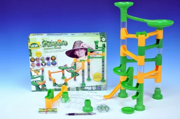 Dráha obsahuje 41 odlišných různě potištěných dílů a 10 barevných kuliček. Hračka je vyrobena z plastu několika barev.