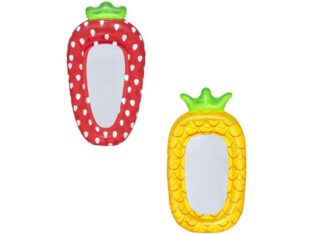 Nafukovací lenoška s veselým designem jahůdky a ananasu o velikosti cca: jahoda: 1,78×1,03 m a ananas: 1,86×1,12 m pro děti od 6 let.