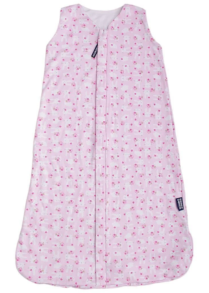 Povrch tvoří kvalitní bavlněný úplet potištěný roztomilými motivy zajíčků a květinek v jemné růžové barvě. Vnitřní podšívka je vyrobena z úpletu z bambusové viskózy – ten je velmi jemný na dotek, dobře saje pot a přirozeně reguluje teplotu. Díky kombinaci těchto materiálů je pytel příjemný i pro citlivou dětskou pokožku.