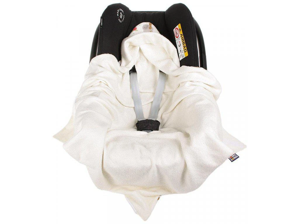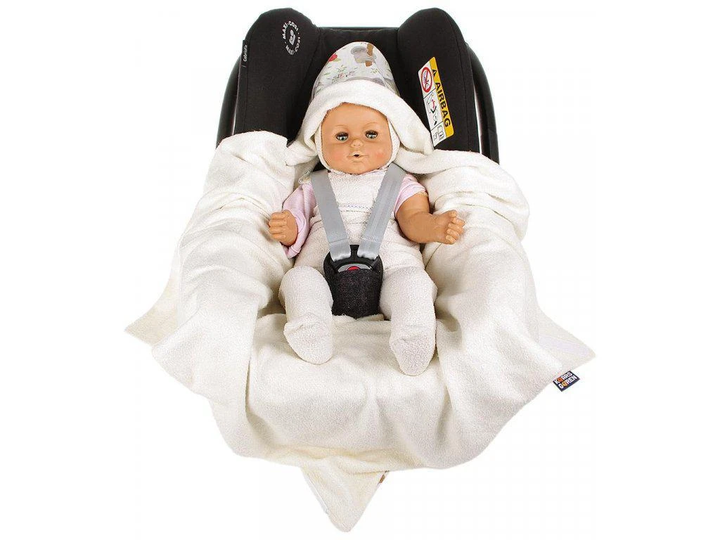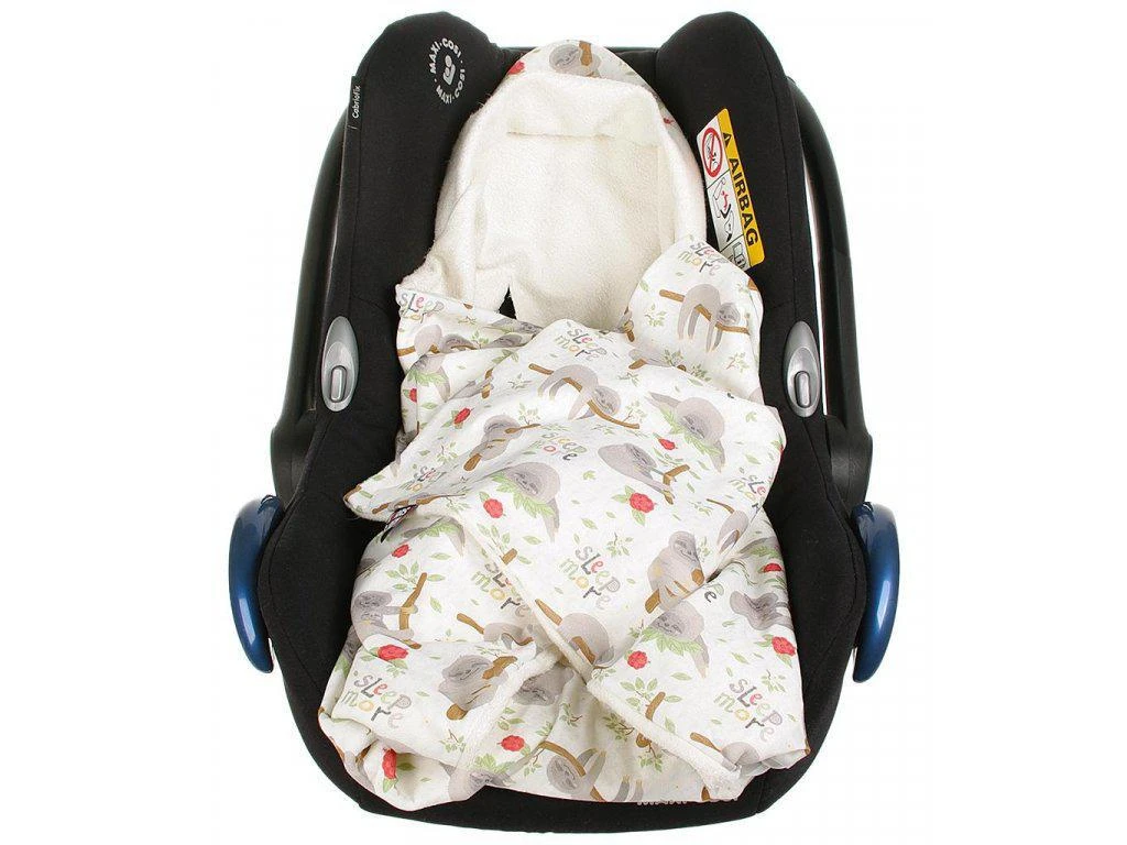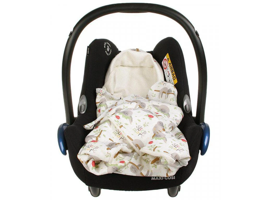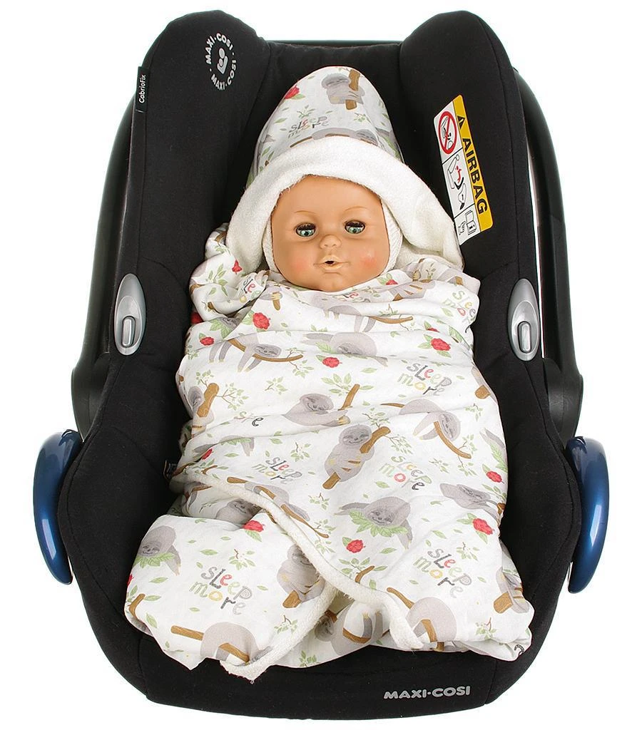 Použití - vložit zavinovačku do autosedačky, otvory protáhnout bezpečnostní pásy, připoutat miminko, podle teploty zavinovačku zavinout a zapnout na suchý zip, nebo nechat otevřenou.