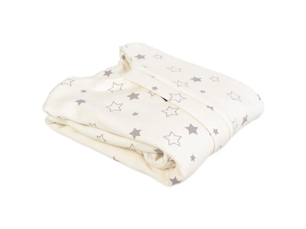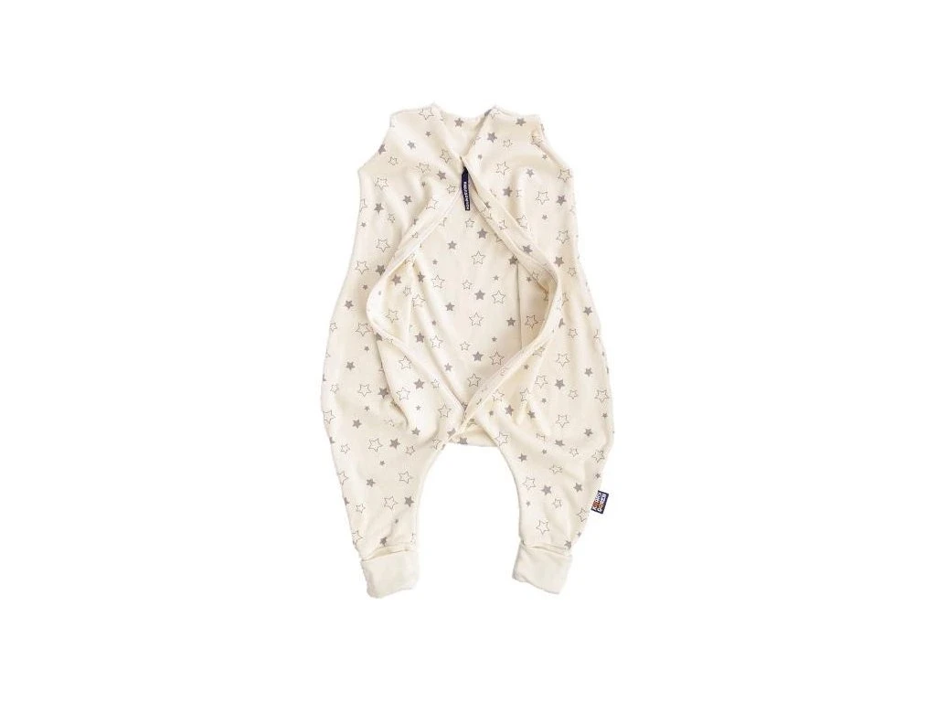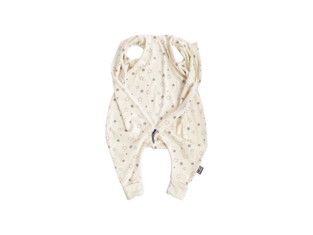 Letní spací pytel pro novorozené miminko s otvory pro nohy v přírodní barvě s motivem šedých hvězdiček, miminko v něm může volně kopat nožičkami. Spací pytel má uprostřed zip a lze jej zcela otevřít, navíc má zip látkovou krytku, která zabraňuje přiskřípnutí krku do zipu.