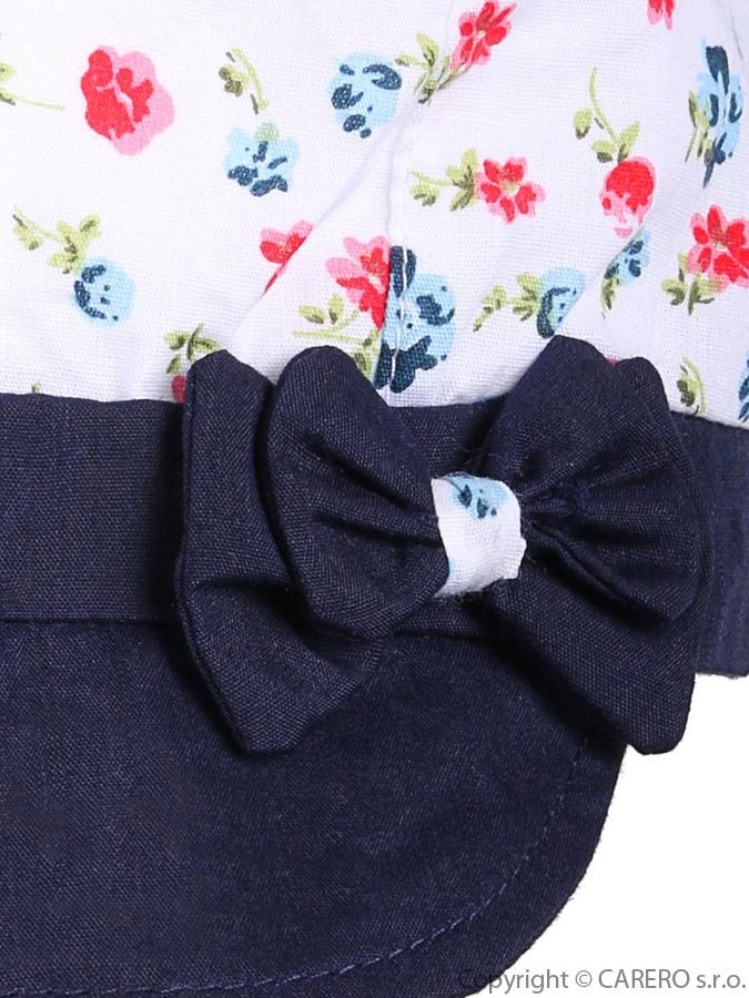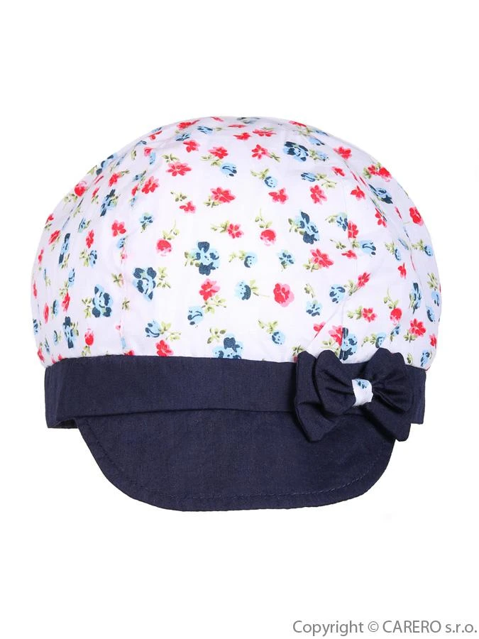 Dětská letní čepička - baret Klara s kšiltem. Čepička má krásný potisk malých kytiček a roztomilou mašličku. Obvod kolem hlavičky cca 54 cm. Složení: 100% bavlna.