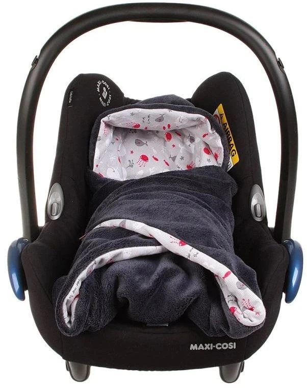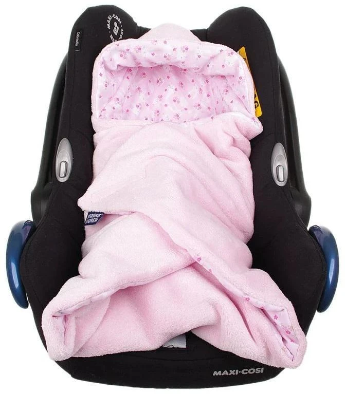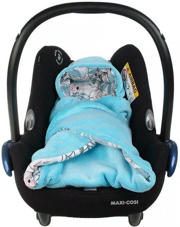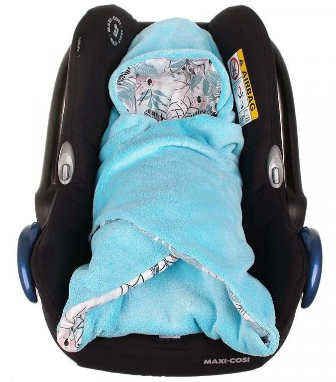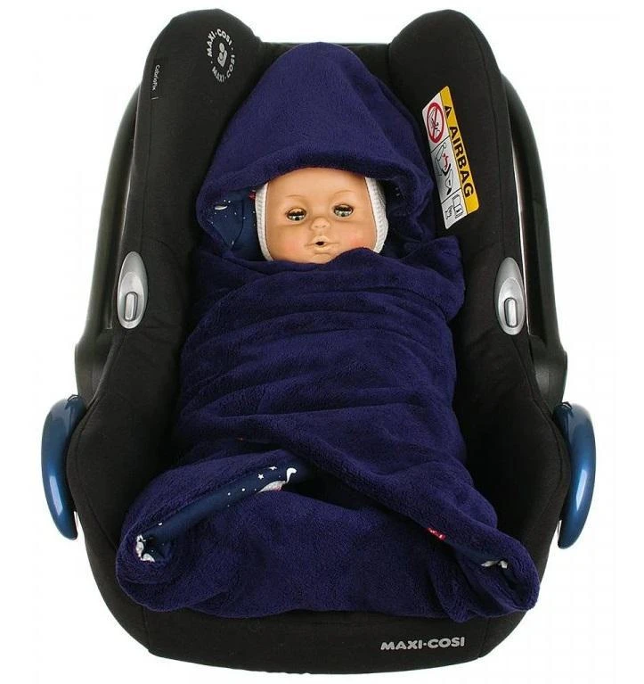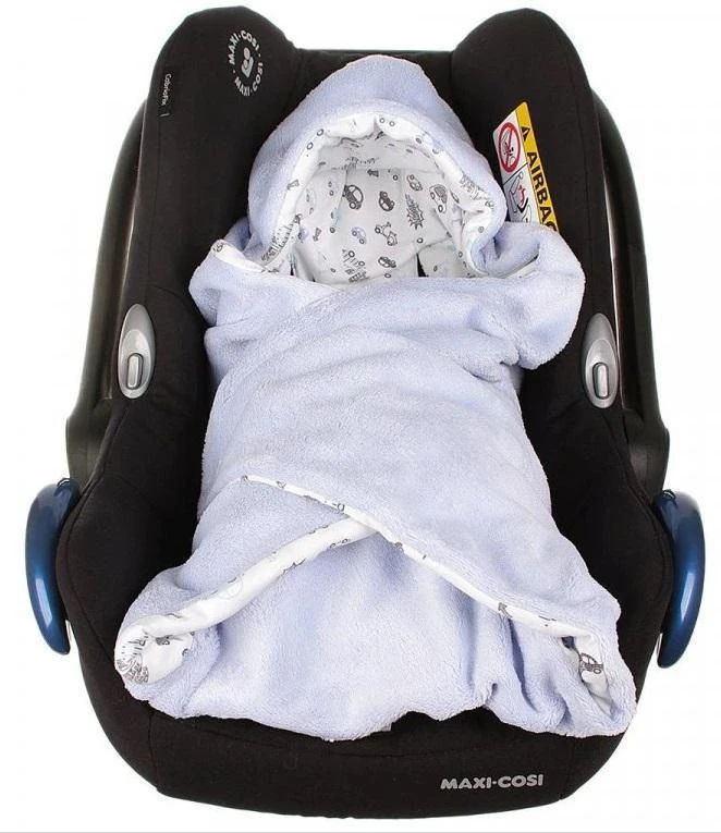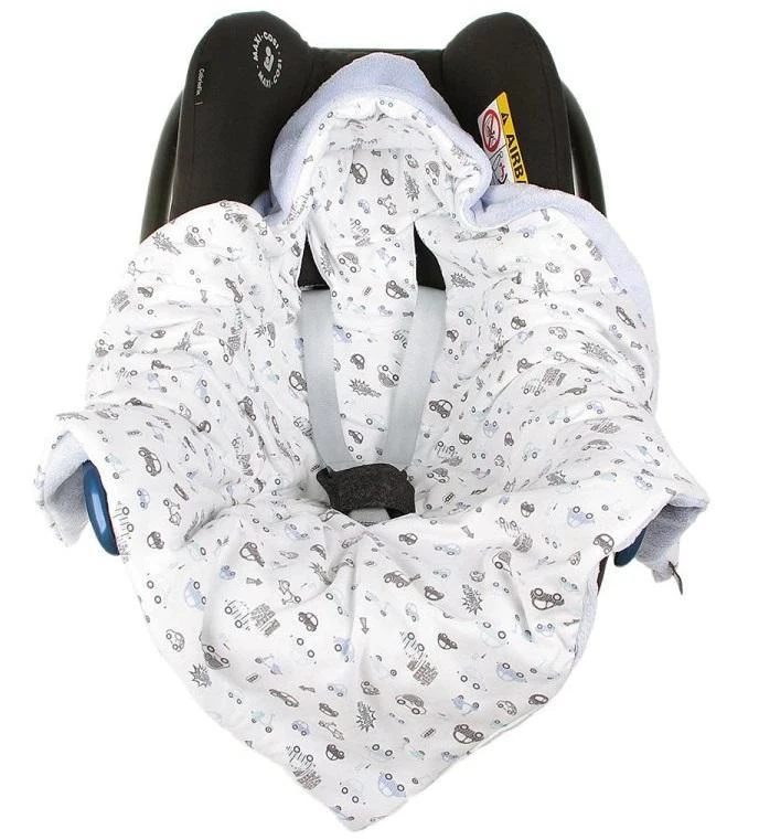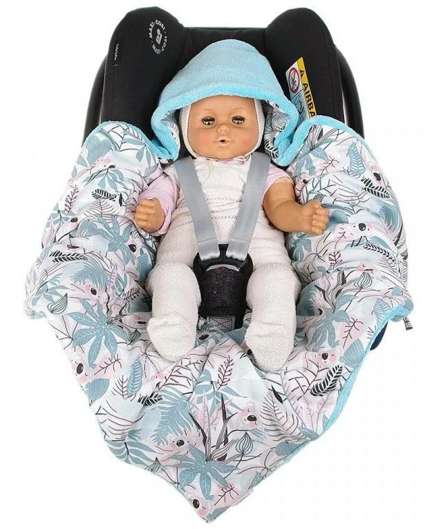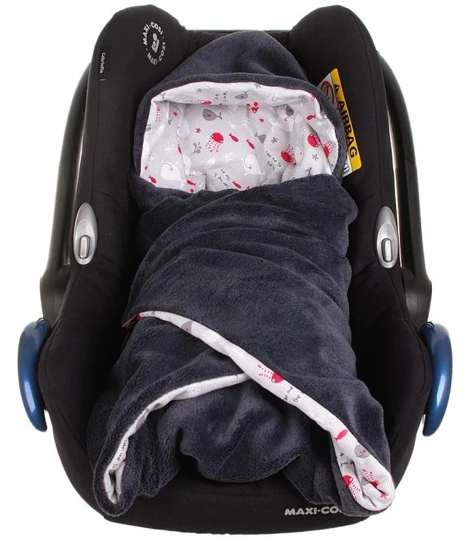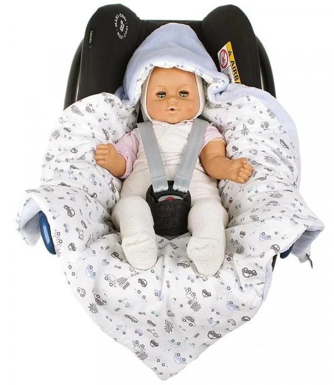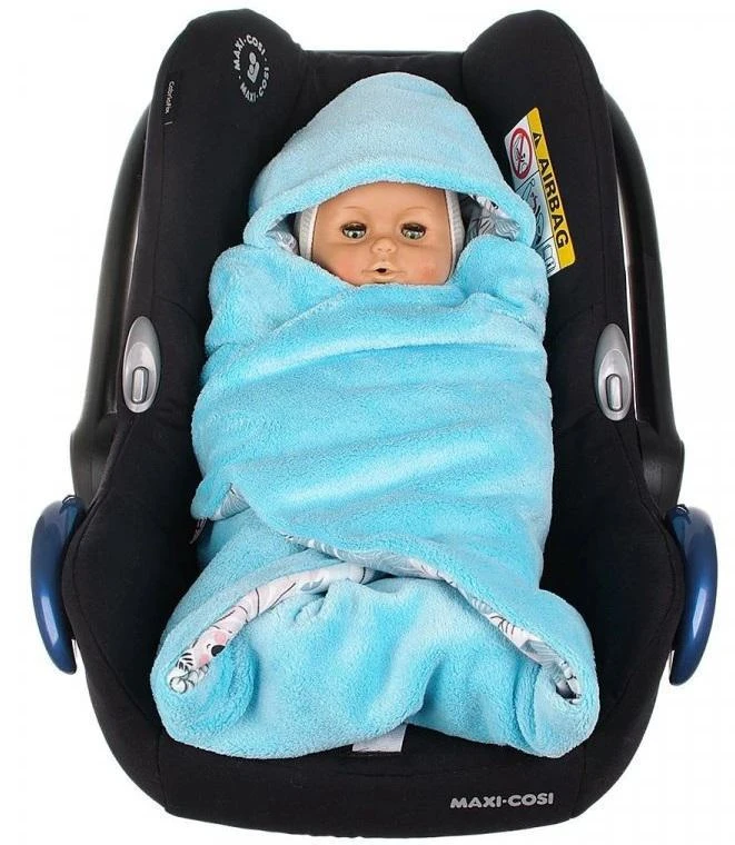 Použití - vložit zavinovačku do autosedačky, otvory protáhnout bezpečnostní pásy, připoutat miminko, podle teploty zavinovačku zavinout a zapnout na suchý zip, nebo nechat otevřenou.