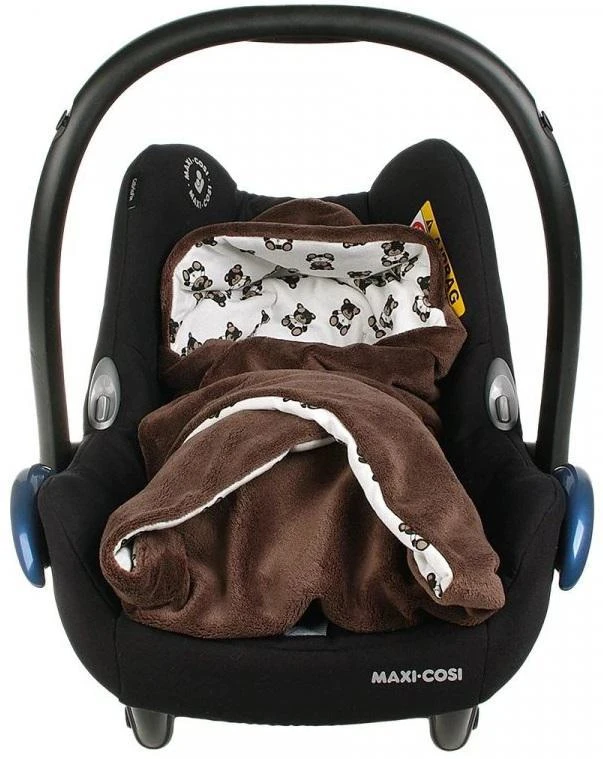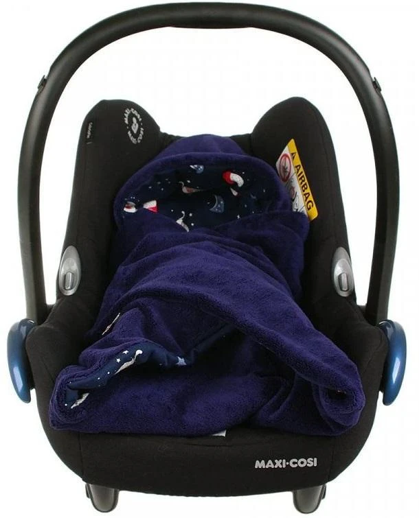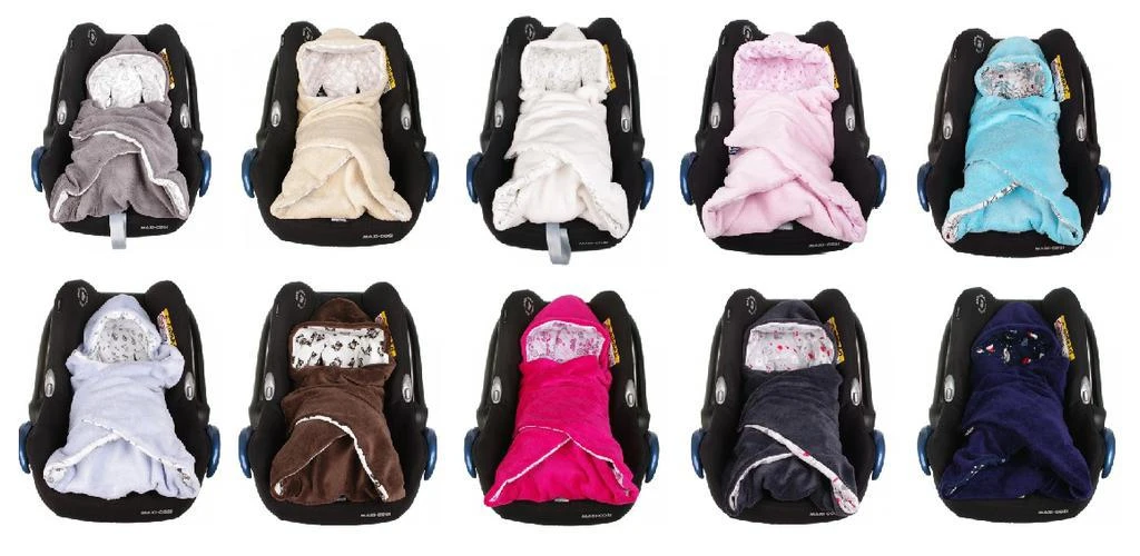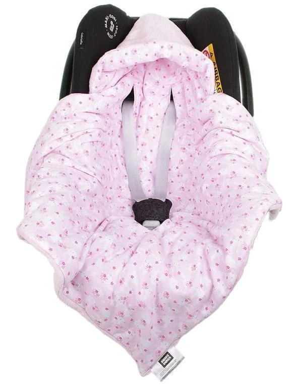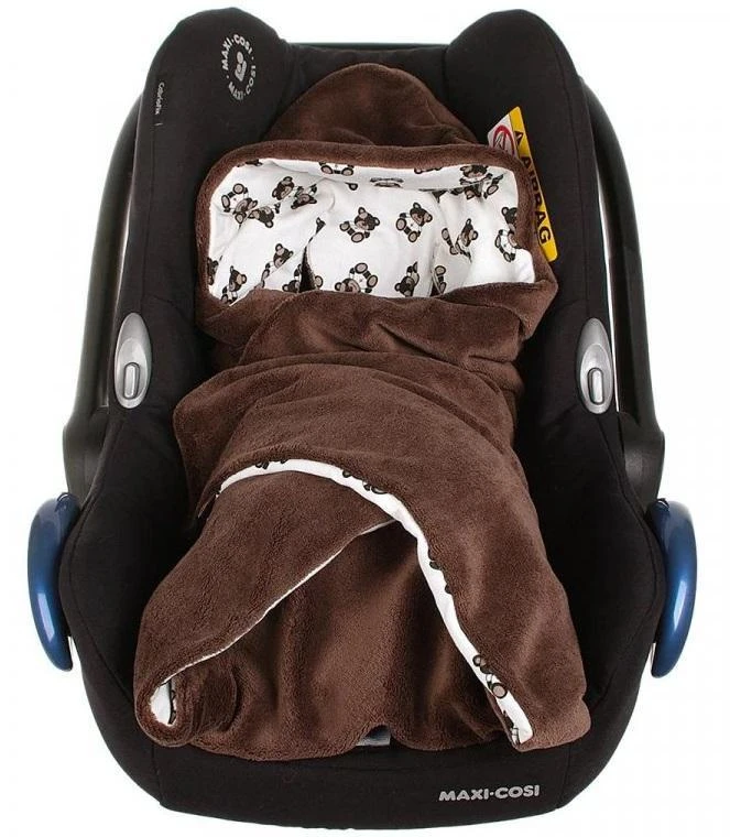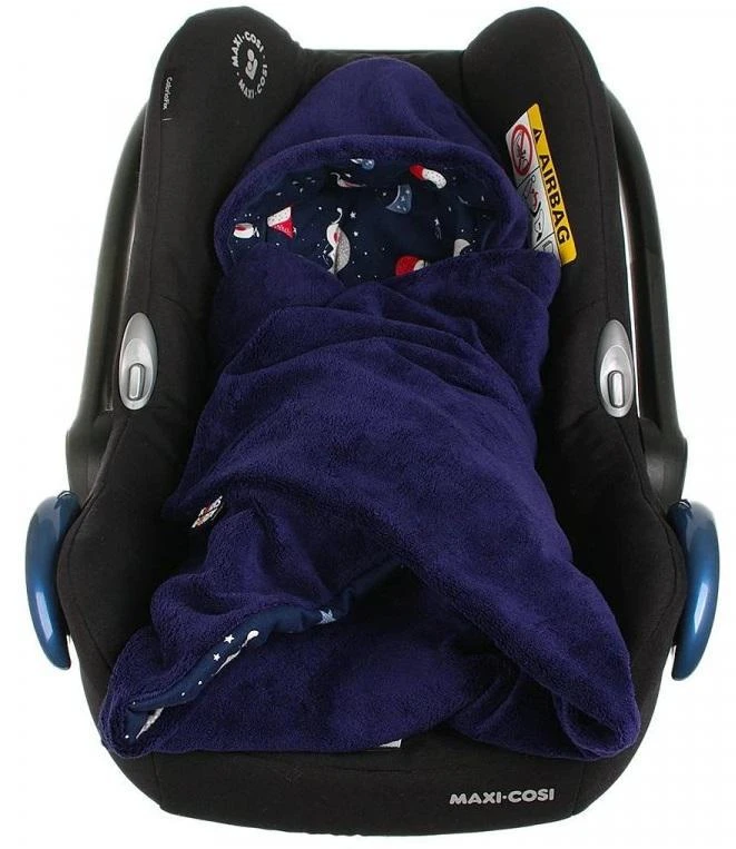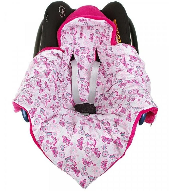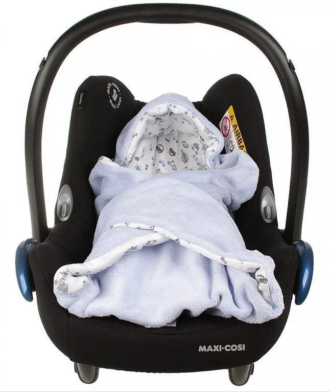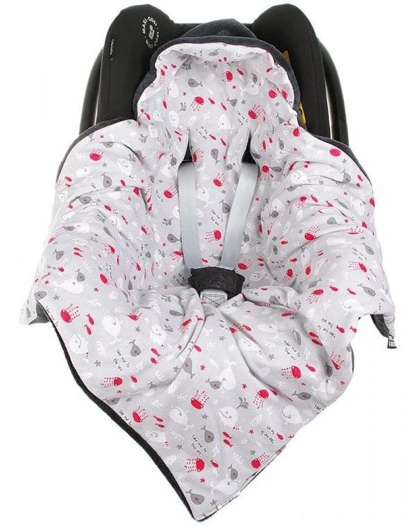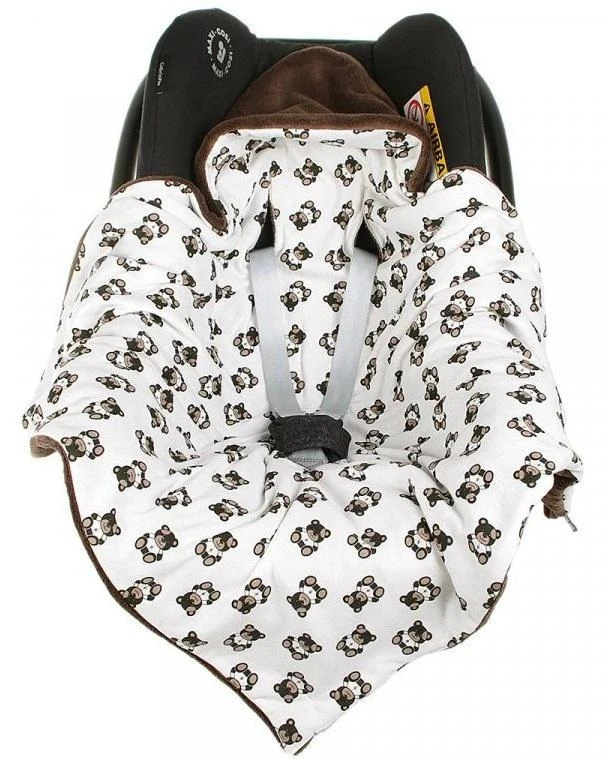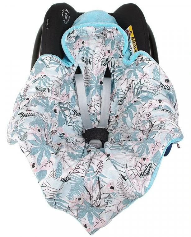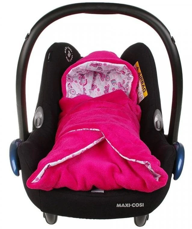Použití - vložit zavinovačku do autosedačky, otvory protáhnout bezpečnostní pásy, připoutat miminko, podle teploty zavinovačku zavinout a zapnout na suchý zip, nebo nechat otevřenou.